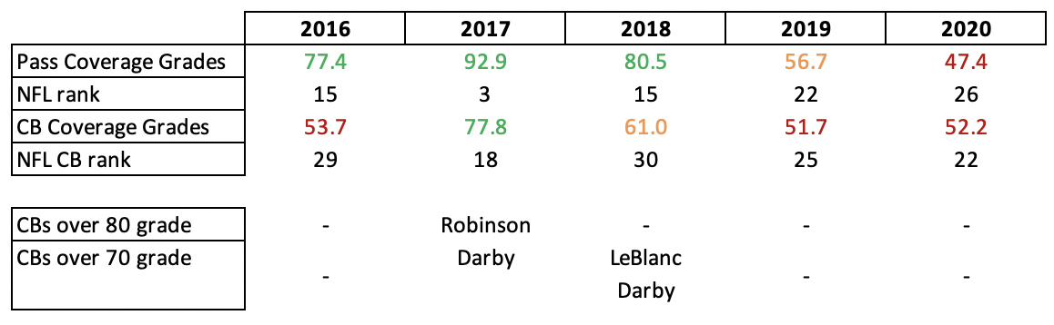 This is clearly impacting the Eagles defense as the Eagles have dropped to near the bottom of the league in overall coverage grades. The grades are worse when you isolate to CBs as a lot of the value in the Eagles coverage defense has been helped by safeties (particularly McLeod) and relatively high LB coverage grades in 2016–2018 (Bradham, Hicks). In the past 5 years, the Eagles have had one season with a CB graded over 80 (Patrick Robinson) and only two seasons with a CB graded over 70 (Darby, LeBlanc) — none of these CBs were drafted players.