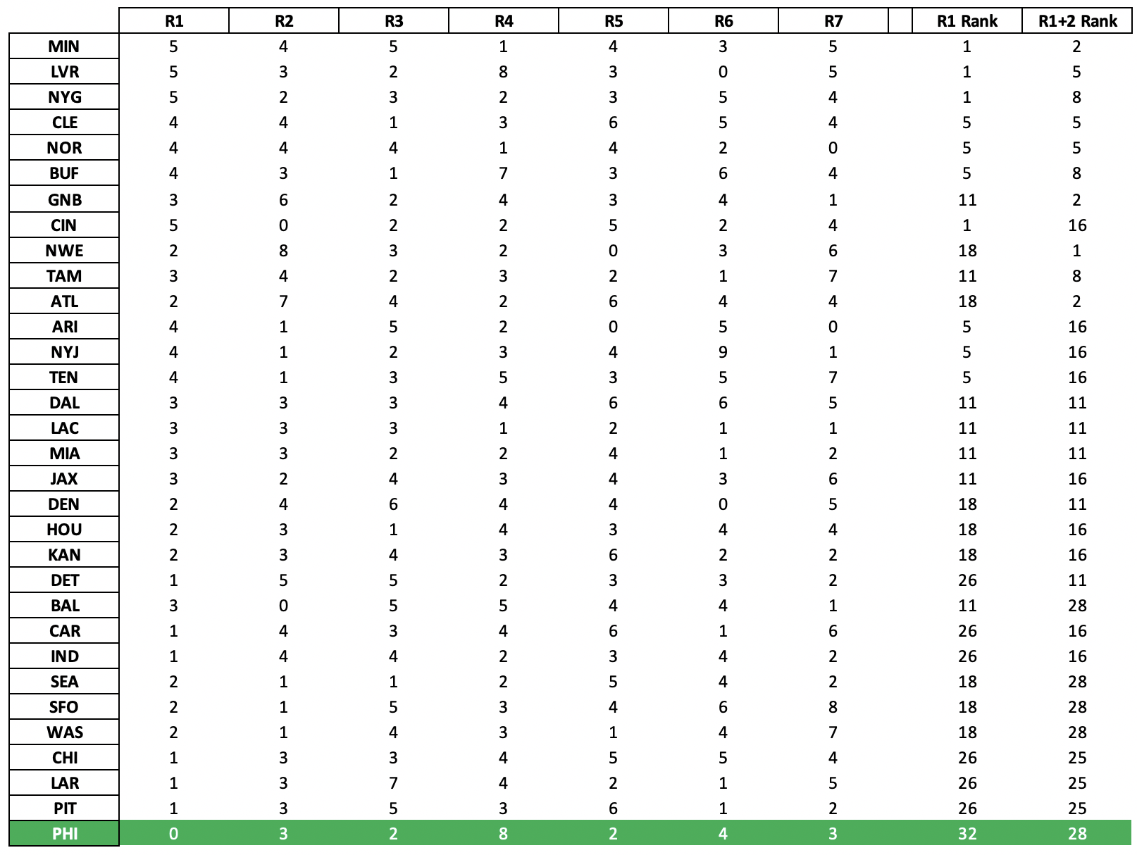 Below shows draft stats from 2010–2021, with the first set of columns showing the pure number of picks used by position group. The second set of columns show draft capital used instead of picks to reflect where the Eagles are using higher or lower picks. Then, the league averages for each are shown and where the Eagles rank compared to the league in how they invest by position.