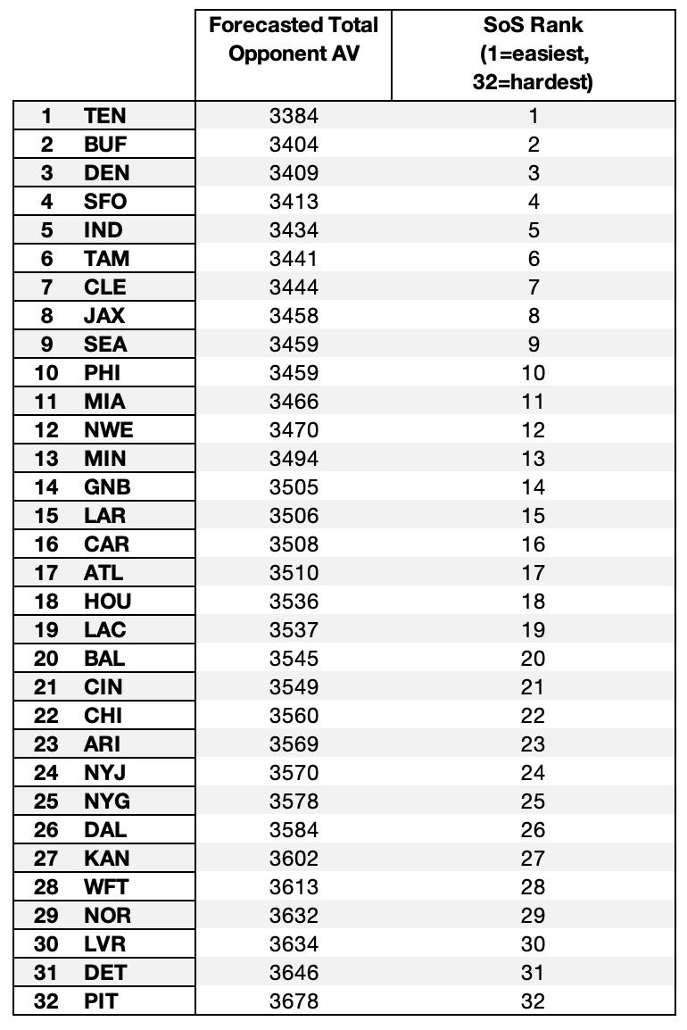 - Applying a strength of schedule modifier to total AV, ranging from the weakest SoS being worth +10 team AV and the hardest SoS being worth -10 AV.