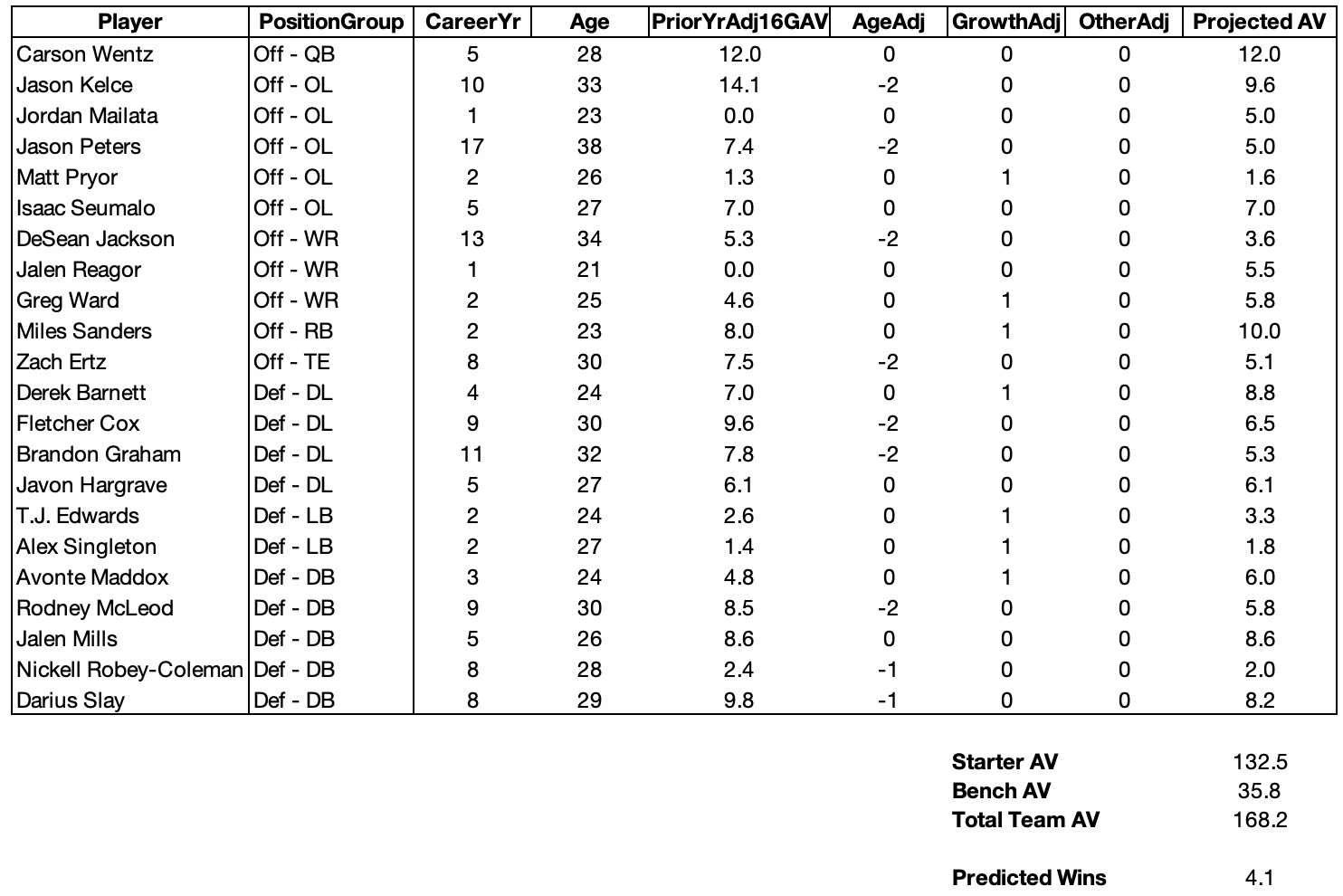 I back-tested this on several teams and seasons, but wanted to share one on the 202 Eagles (since this is primarily and Eagles blog page). Below lists their projected 2020 starters at the season start - Desean is listed in although he ended up barely playing and the OL reflects JP at LT and Pryor at RG with Dillard and Brooks out before the season. I made no manual adjustments and the projected win total comes out at 4.1 wins which is right where the Eagles were.