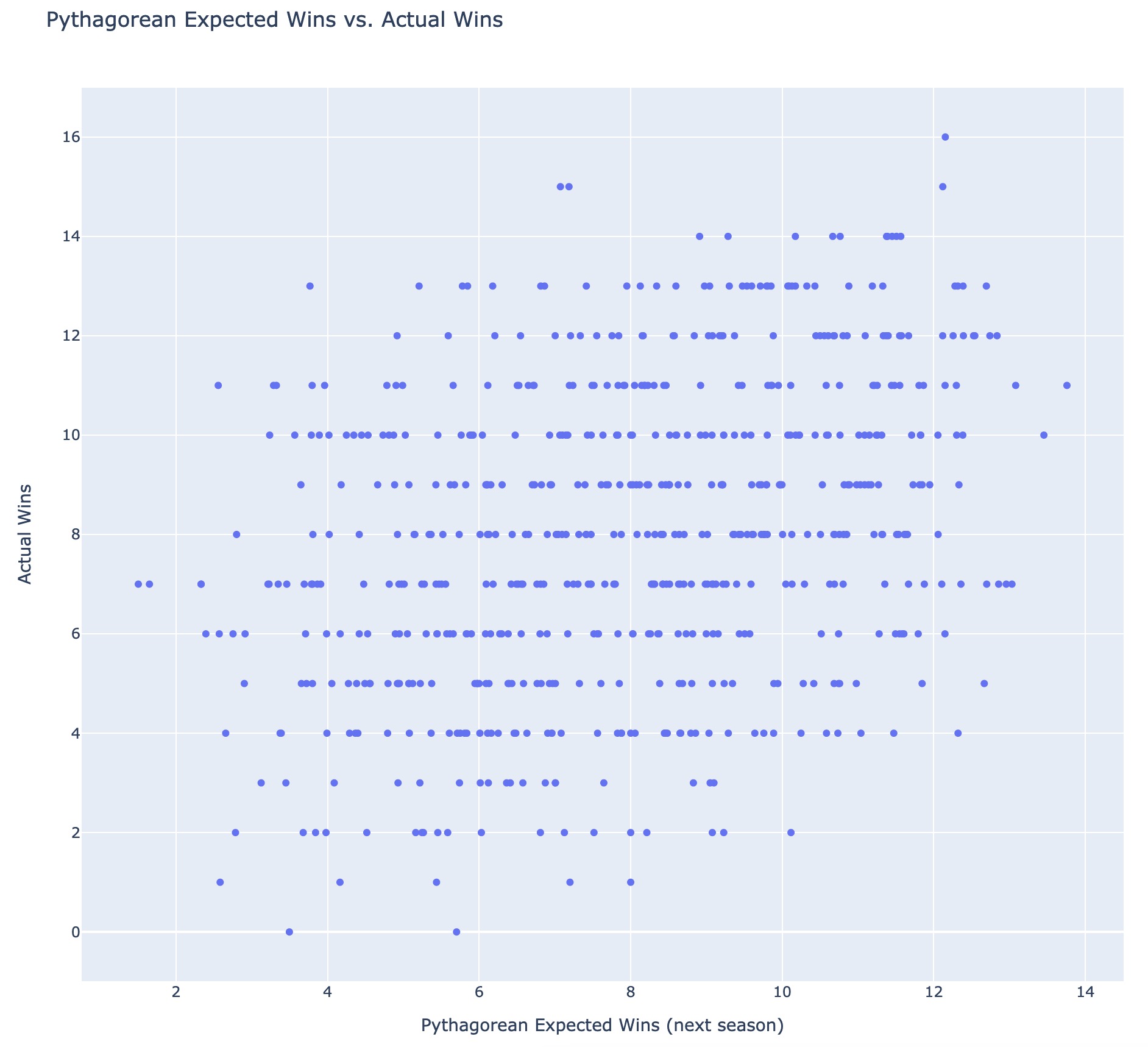 But the ability for the Pythagorean model to predict next season wins is poor as there is very little correlation below between expected next season wins and actual wins.