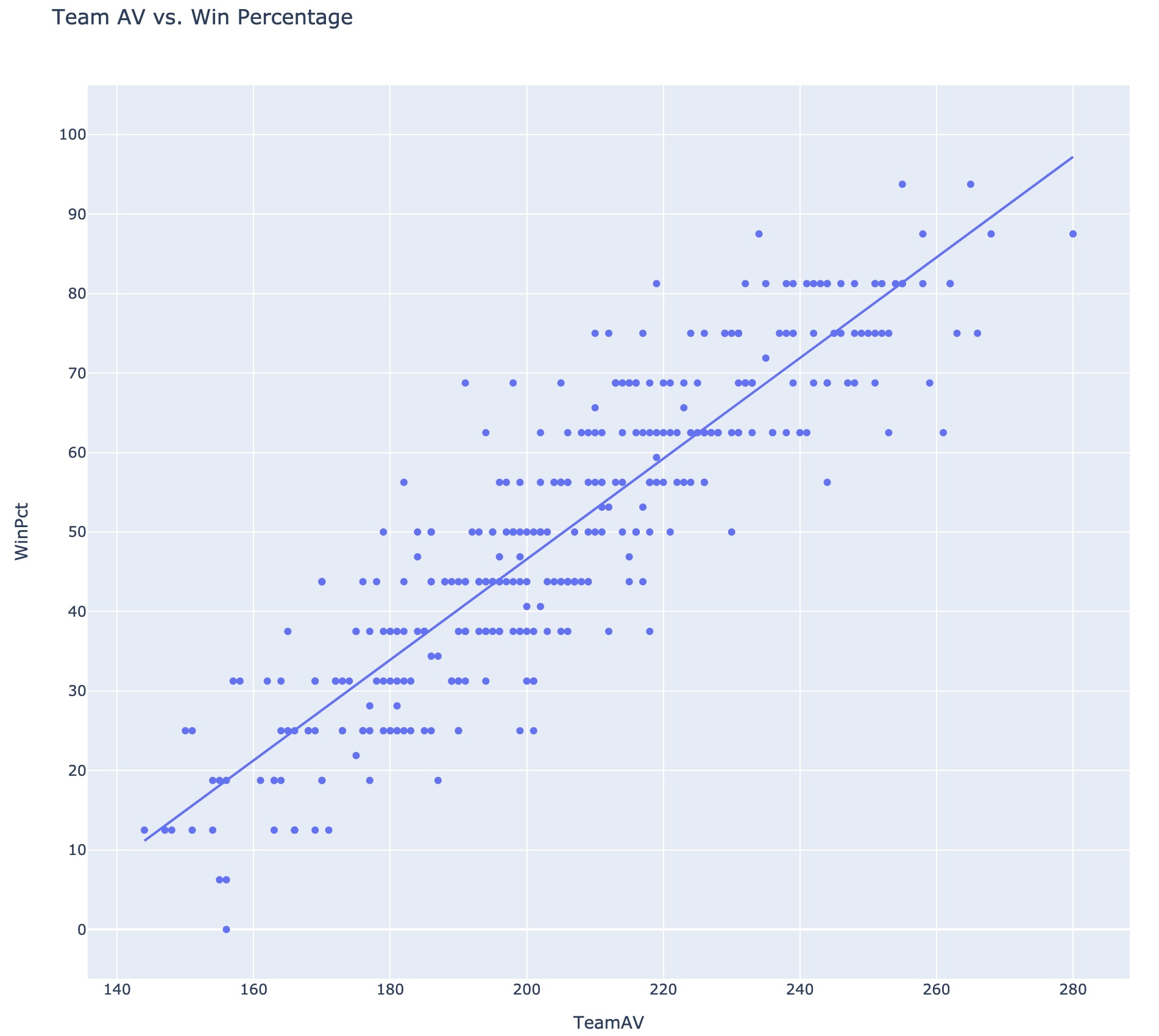 AV, like other similar metrics, has its flaws, specifically for more difficult positions to assign contribution to like offensive and defensive line, while skill positions are much easier. At an individual player level, AV will have variance issues but in aggregate, a metric like AV becomes very useful. Below shows the relationship between a team’s aggregate AV and its win percentage: