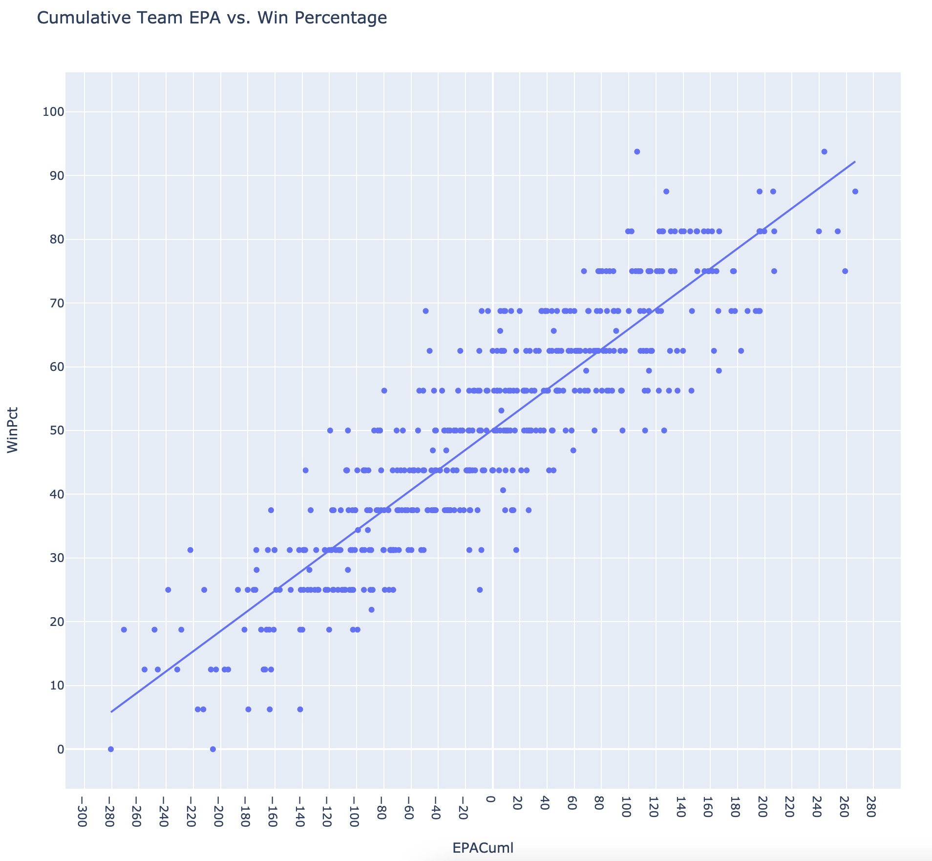 But for these purposes, AV and EPA are remarkably consistent. Here is the same chart as above, but comparing EPA to win percentage, which has the same exact R2 of 0.795: