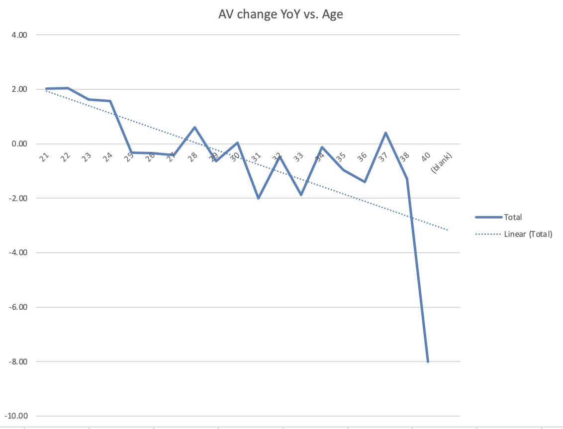 To model this, I give players in their first 3 seasons a +25% AV adjustment and a -16% AV adjustment starting at age 29 and a -32% AV adjustment at 31.