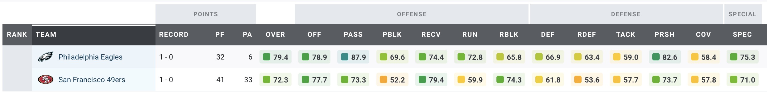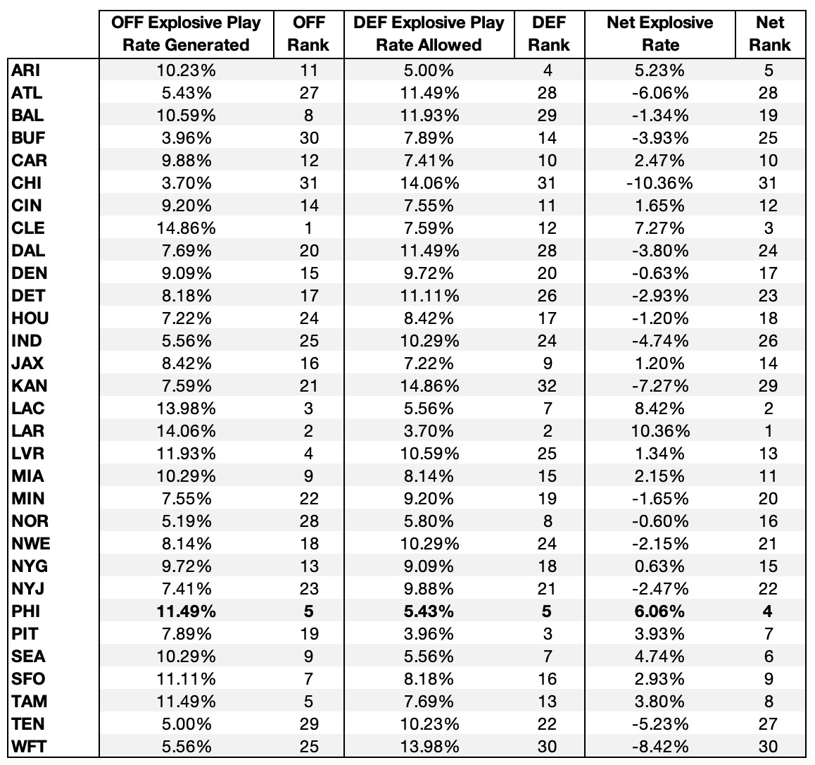 After week 1, the Eagles offense was 5th in the league in explosive plays generated and 5th best in defensive explosive plays allowed. Both of these are better than SF, whose offense had some big plays but also allowed a much worse Detroit team to generate explosive plays on 8% of plays.