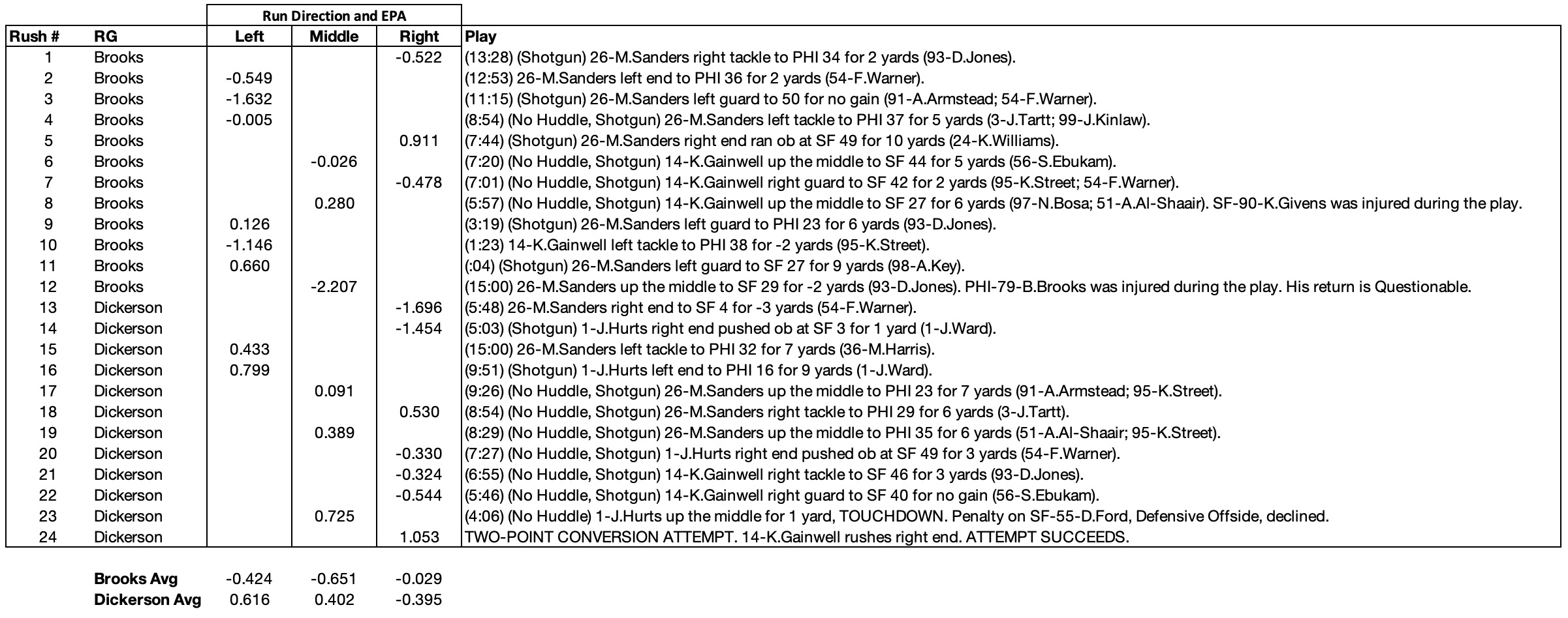 Not as much to look at with run blocking as Landon did better here. Below are each of the rush attempts with Brooks and Landon in the game, by rush direction, and the EPA for each rush: