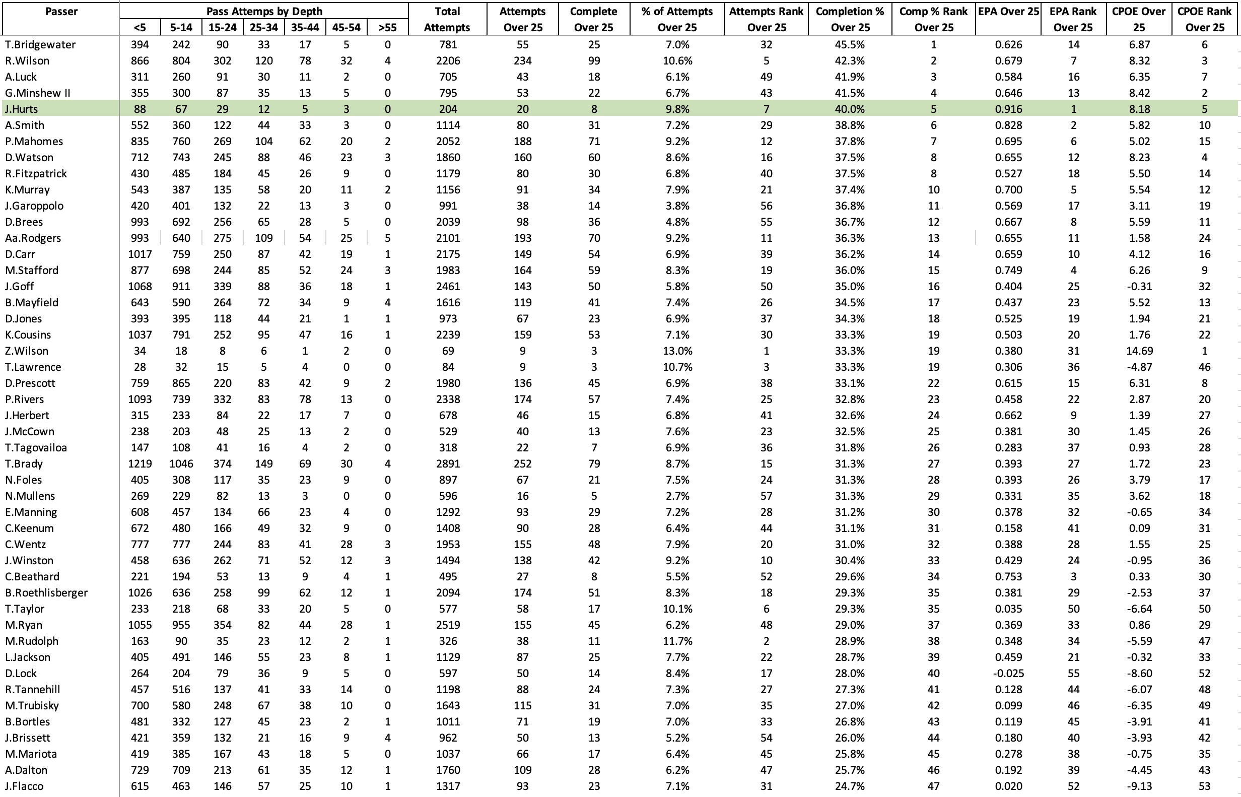 - His 0.916 Expected Points Added (EPA) per deep passing attempt ranks 1st overall by a good margin.