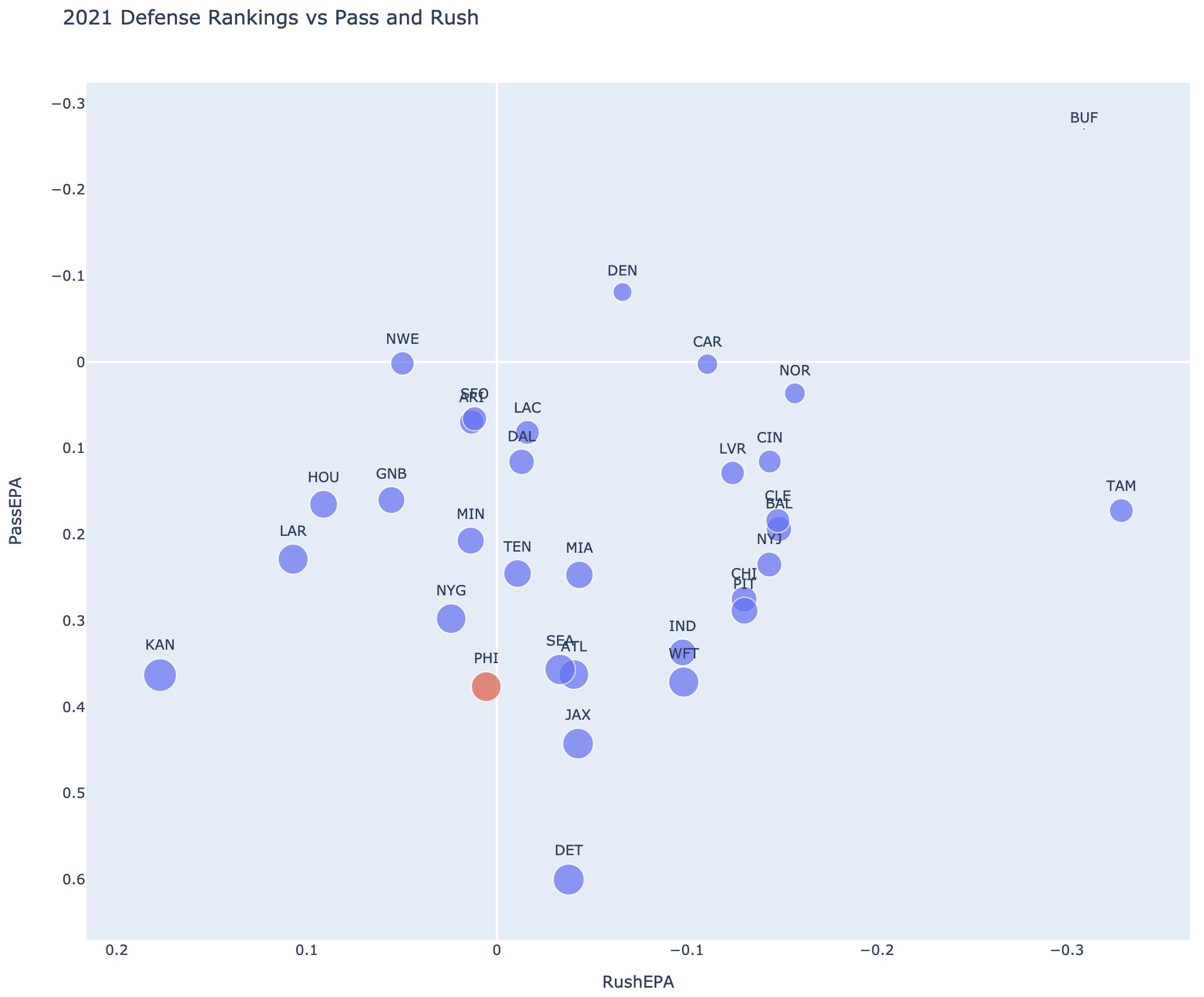 **They are one of only 10 defenses actually allowing a positive EPA per play (0.006) on opposing team rushes. Yes, passes have even greater value, but it is rare to allow a positive EPA on rushes.