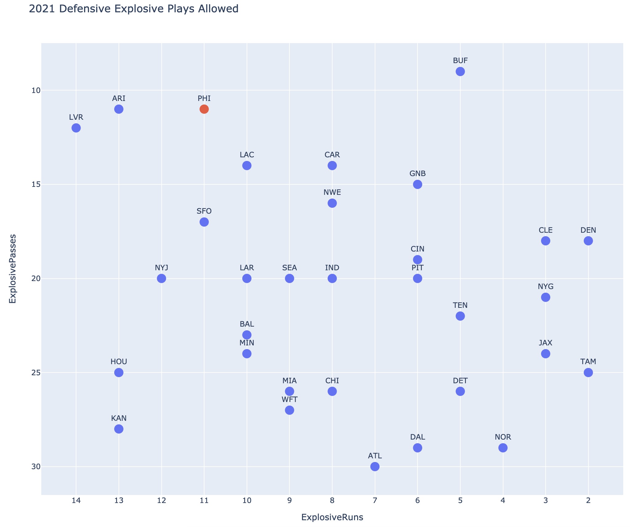 The second chart above in the run defense section shows that the Eagles are successful here so far - they are tied with Arizona for 2nd in the league in fewest explosive passes allowed, behind only Buffalo. This is what we want the defense to be.