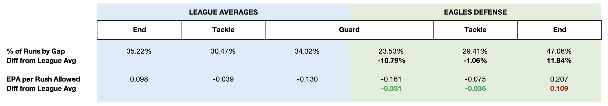 **The Eagles defense is seeing a much higher percentage of outside runs than the league average, with almost half of rushes against them being wide, and giving up 0.207 EPA per play on outside runs, ranked 26th in the league (for a defense, a lower EPA is better). As a point of reference, the league average EPA per pass is 0.192. Above I said the analytics community hates runs because they have negative EPA and always less value than passes but the Eagles are allowing more value on outside runs than the average league pass.