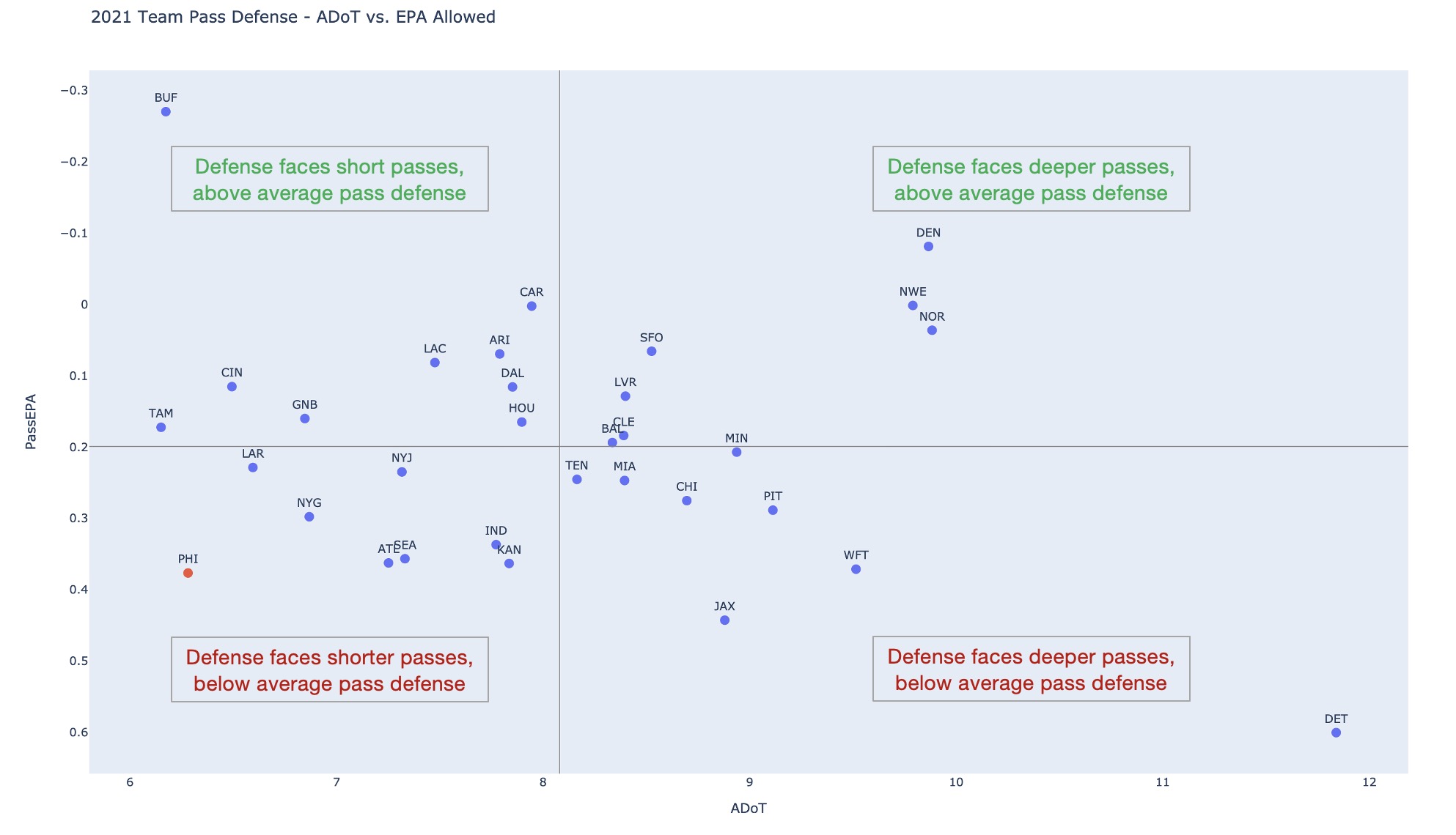 The Eagles opponents, whether by design or taking advantage of off-coverage, are living off of short passing. The Eagles force the 3rd lowest average depth of target in the league behind Buffalo and Tamp Bay, but are 29th in the league in EPA per pass play allowed (ahead of only Detroit and Jacksonville).