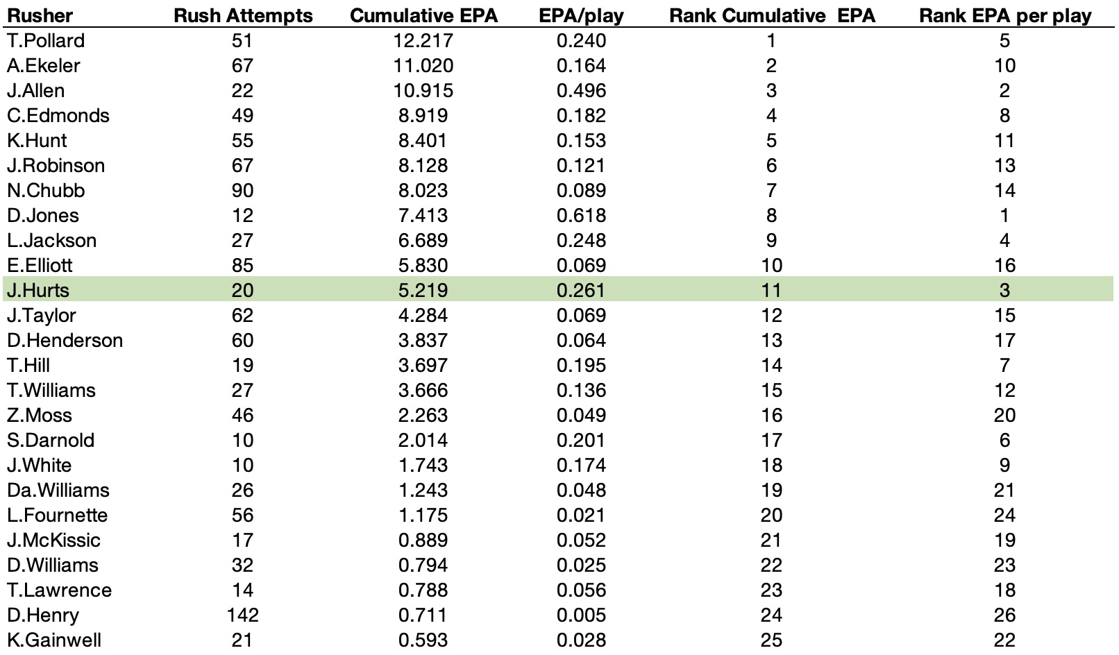 I said I think Hurts has a good floor on his value because of his mobility and that continues to show. Compared to all rushers in the league, Hurts is 11th in cumulative EPA and 3rd in EPA per play. This is for all rushers, not just QBs.
