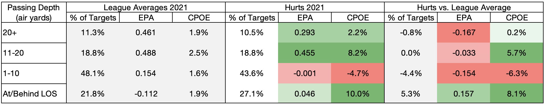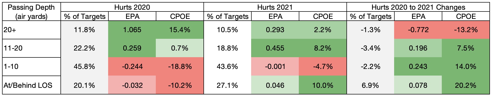 I looked at Hurts’ CPOE and EPA by passing depth, comparing him in 2021 to 2020: