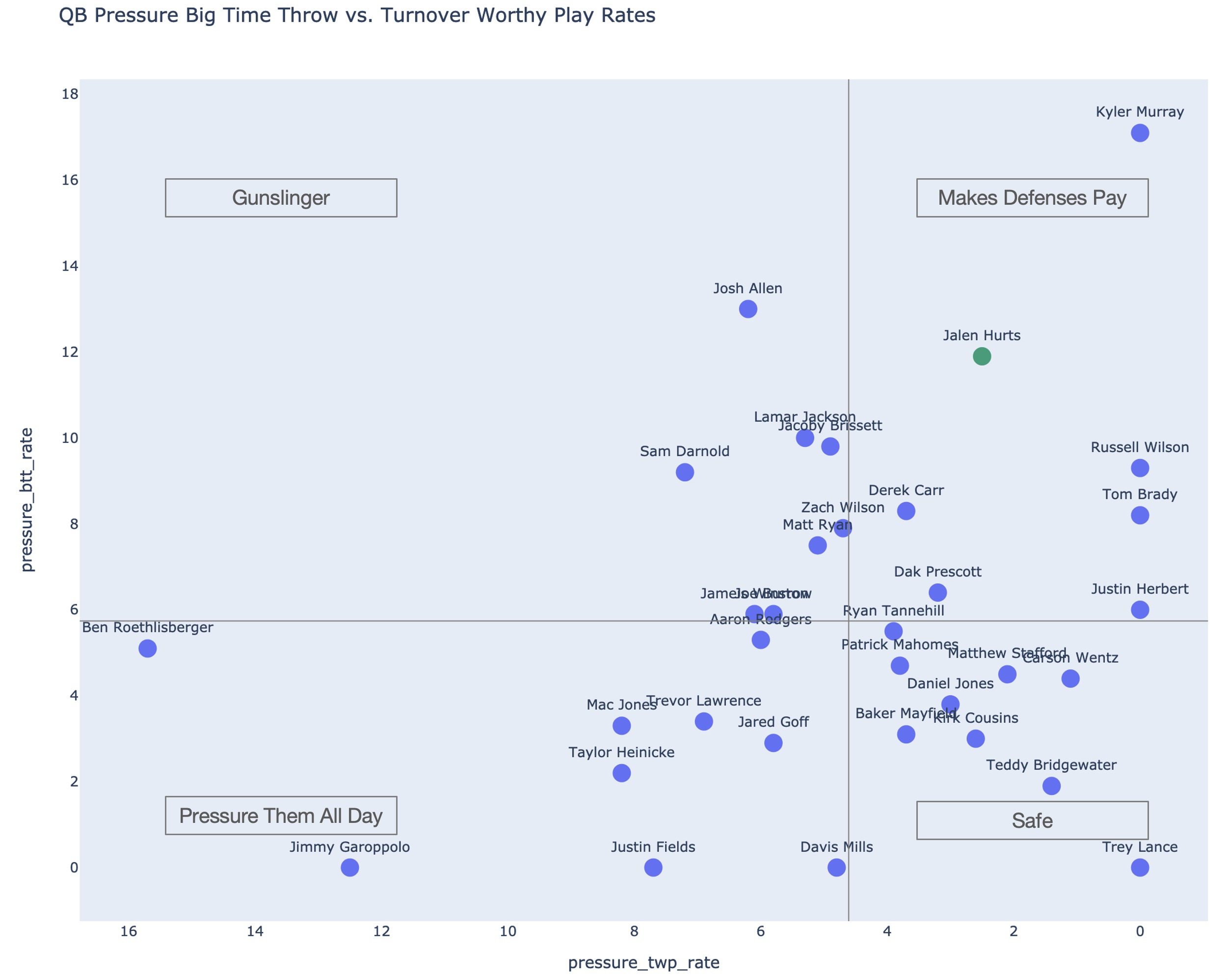 Looking at his explosive play rate and turnovers, Hurts has improved here and again shines under pressure. Below shows big time throw rate vs. turnover worthy play rate while under pressure. Again, Hurts shows up with the best QBs in the league, making defenses pay for pressuring him.
