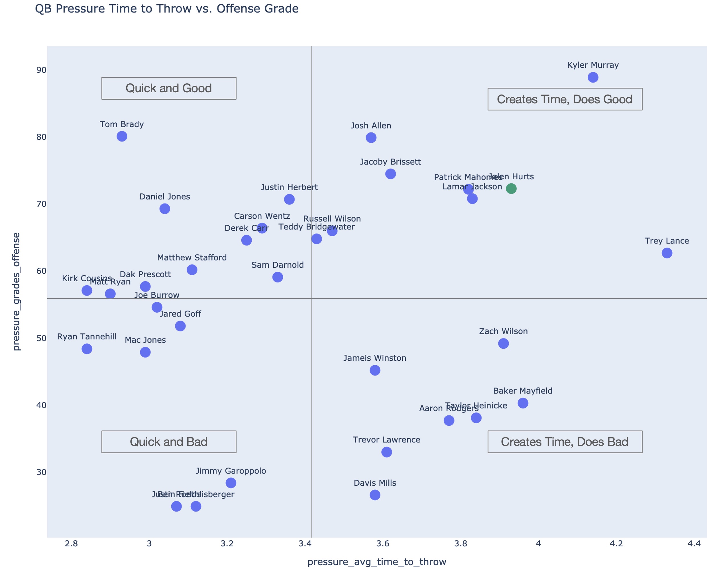 But mobility is not just rushing, it is creating time in the pocket and Hurts also continues to add value here. First, here is time to throw vs. passing grade while under pressure: