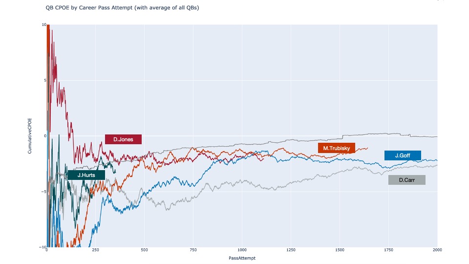 Hurts should near 750 career passing attempts by the end of the season. If Hurts suddenly starts looking better and improves his career CPOE from it’s current -3.6 to something close to 0 by the end of the year, there is room for optimism. And if he doesn’t, then Hurts’ supporters will be banking on him doing what only a handful have done.
