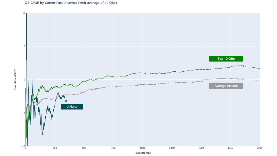 First, here is Hurts’ career Completion Percentage Over Expectation (CPOE) vs. the average of all QBs drafted over the past decade-plus and the average of the top 10 QBs in the same period. Hurts is clearly trending like an average QB.