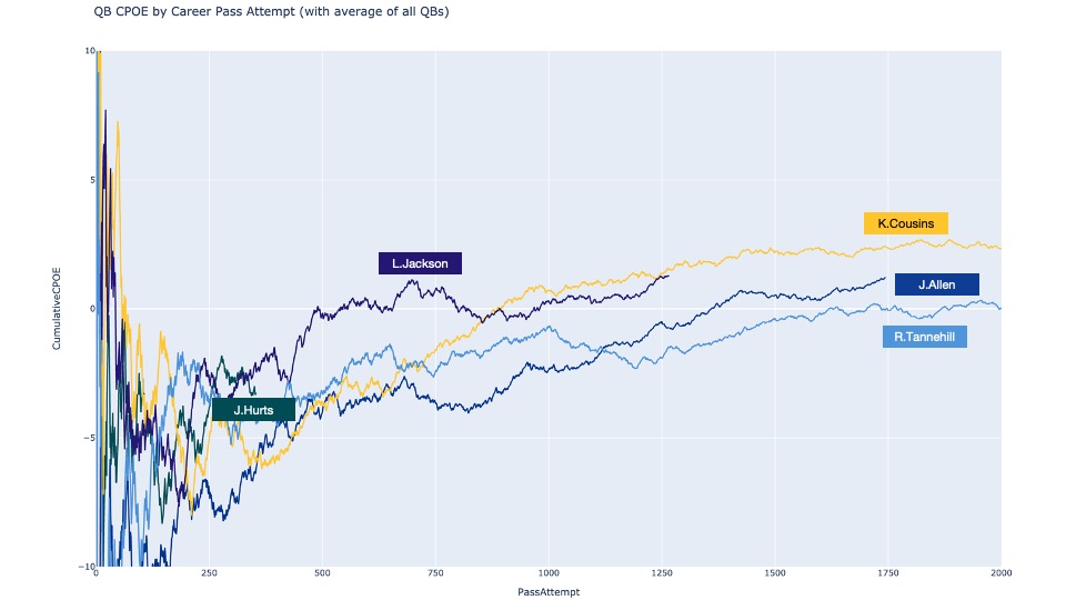 Now on the bright side, there are top QBs whose early career looked similar to or worse than Hurts, including Lamar, Cousins, Tannehill, and the classic “figured out accuracy in the pros” Josh Allen. Some may question me including Cousins or even Tannehill in a “top QBs” list but they are 8th and 10th respectively in CPOE over the past 5 years and 5th and 6th over the past 3 years. Both developed later than typical, stabilizing around their career CPOE between 1,500-2,000 career passing attempts. Developing on a trend like one of these QBs would be the bull case for Hurts.