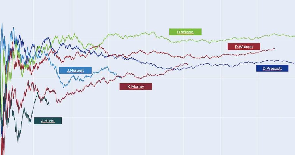 Next, here is Hurts vs. six of the top ten QBs in this period (Wilson, Watson, Dak, Stafford, Herbert, and Kyler Murray). Again, Hurts looks like more of an average QB as each of these six had accuracy numbers that stabilized higher much quicker than Hurts.