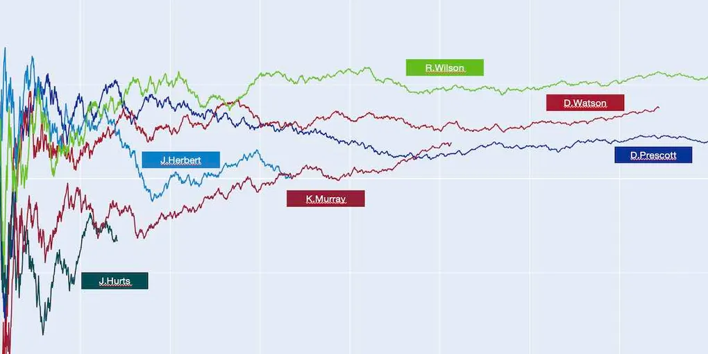 Next, here is Hurts vs. six of the top ten QBs in this period (Wilson, Watson, Dak, Stafford, Herbert, and Kyler Murray). Again, Hurts looks like more of an average QB as each of these six had accuracy numbers that stabilized higher much quicker than Hurts.