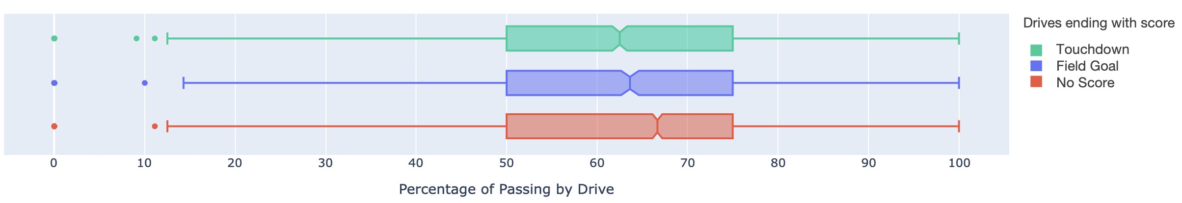 The two ends - 0% passing drives and 100% passing drives - both have mini-peaks as well which was puzzling. It turns out these drives are primarily drives that start deep in the opponent territory (the opponent’s 30 yard line or lower).