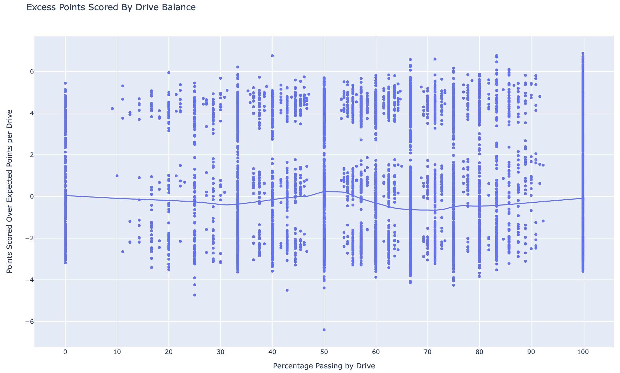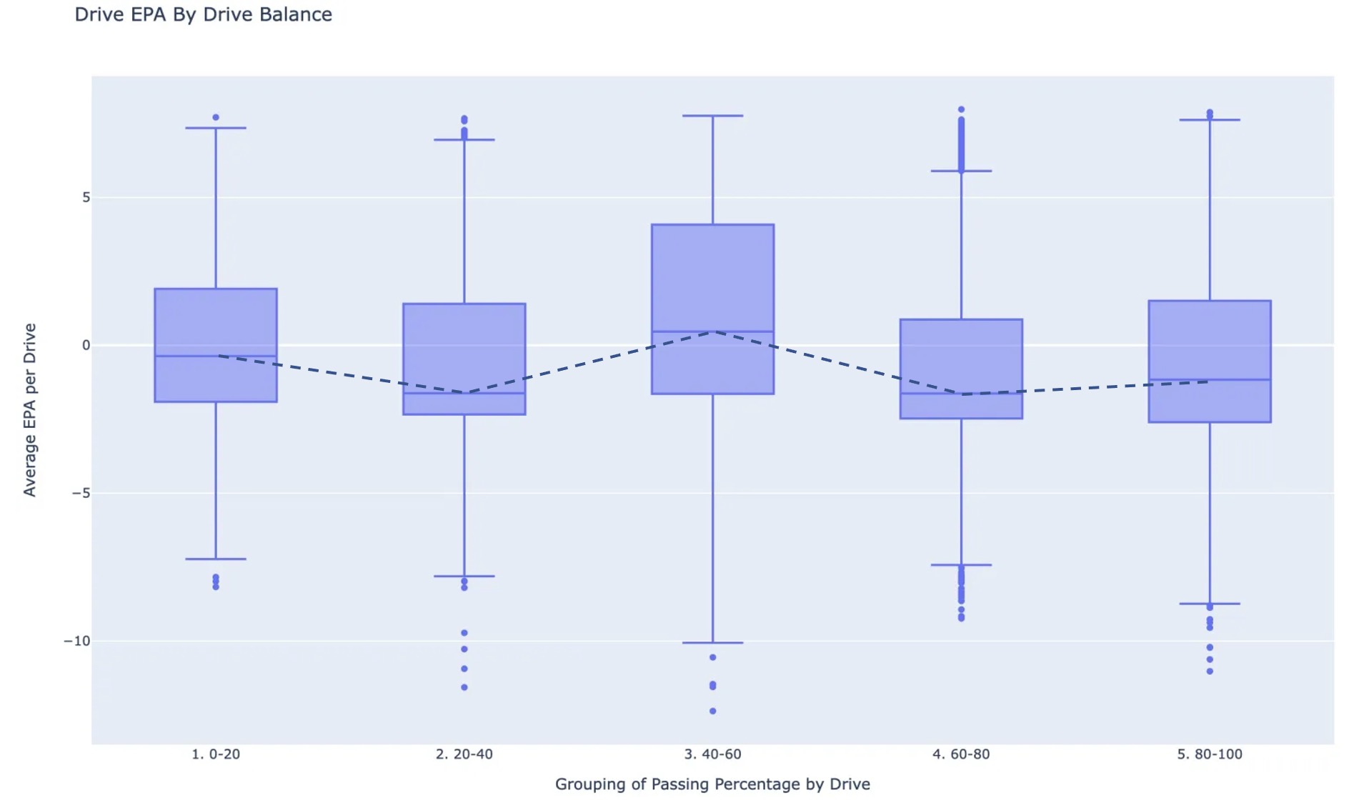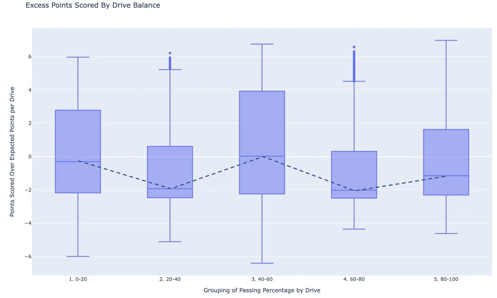 The middle quintile between 40-60% passing (“balanced drives”) has the highest average points scored vs. expected drive points with a very slight positive 0.02 excess points scored. It also has the highest range with 25% of balanced drives scoring between +0.02 and +3.93 excess points. All other quintiles have negative median excess points.