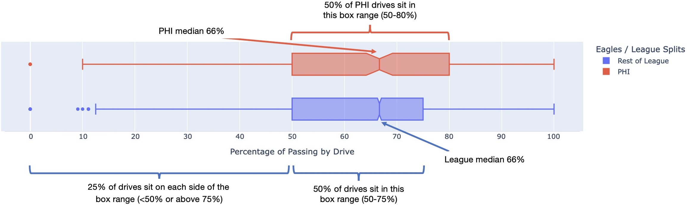 The Eagles (red bar) had the same median drive balance although most in Philly, including me, would not believe that. Philly does skew towards heavier passing though - the top red box shows the centerline (median) at 66% but the right-hand side of the box stretches out to 80% passing, meaning that 25% of their drives were between 66-80% passing (vs. the league average where 25% of drives were between 66-75%). Not a huge skew, but the Eagles definitely use more passing-heavy drives.
