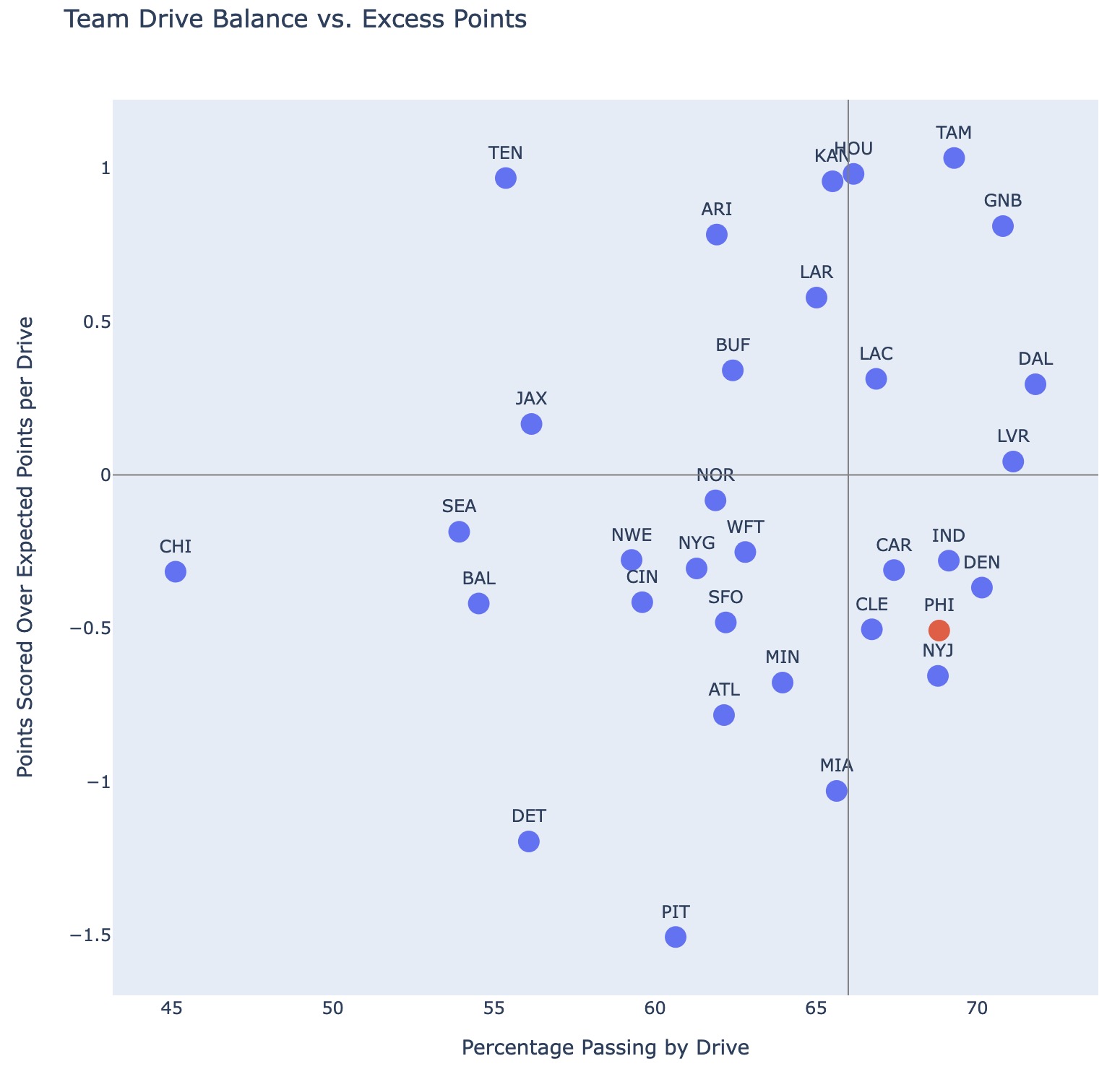 And lastly, a look at every team’s run/pass balance vs. excess points scored in 2021. Teams with better QBs have higher excess points scored (no surprise) but they are not all heavy passing teams - Brady, Rodgers, Dak, and Herbert are all more pass-heavy than the league average but Kyler, Tannehill, Josh Allen, Stafford, and Mahomes (barely) are less pass-heavy than the overall league. The Eagles, unsurprisingly in 2021, are more pass heavy with lower value as their passing game has struggled.