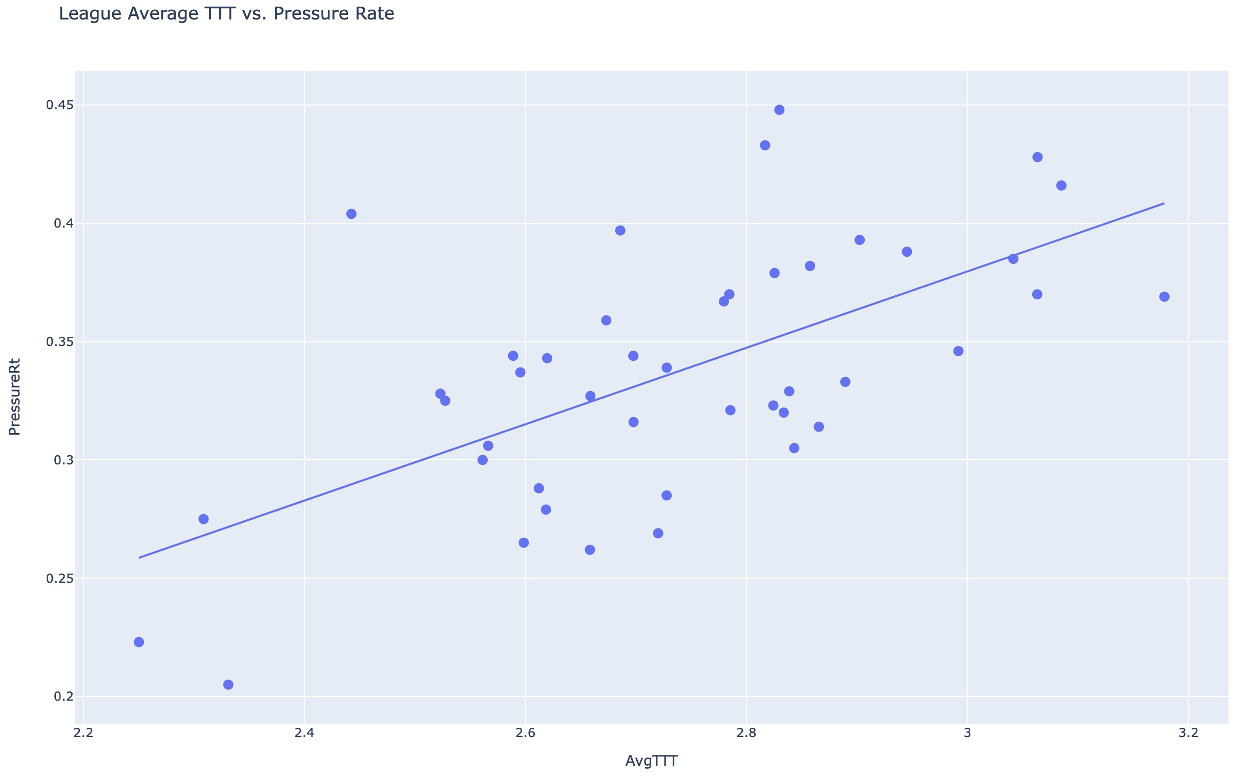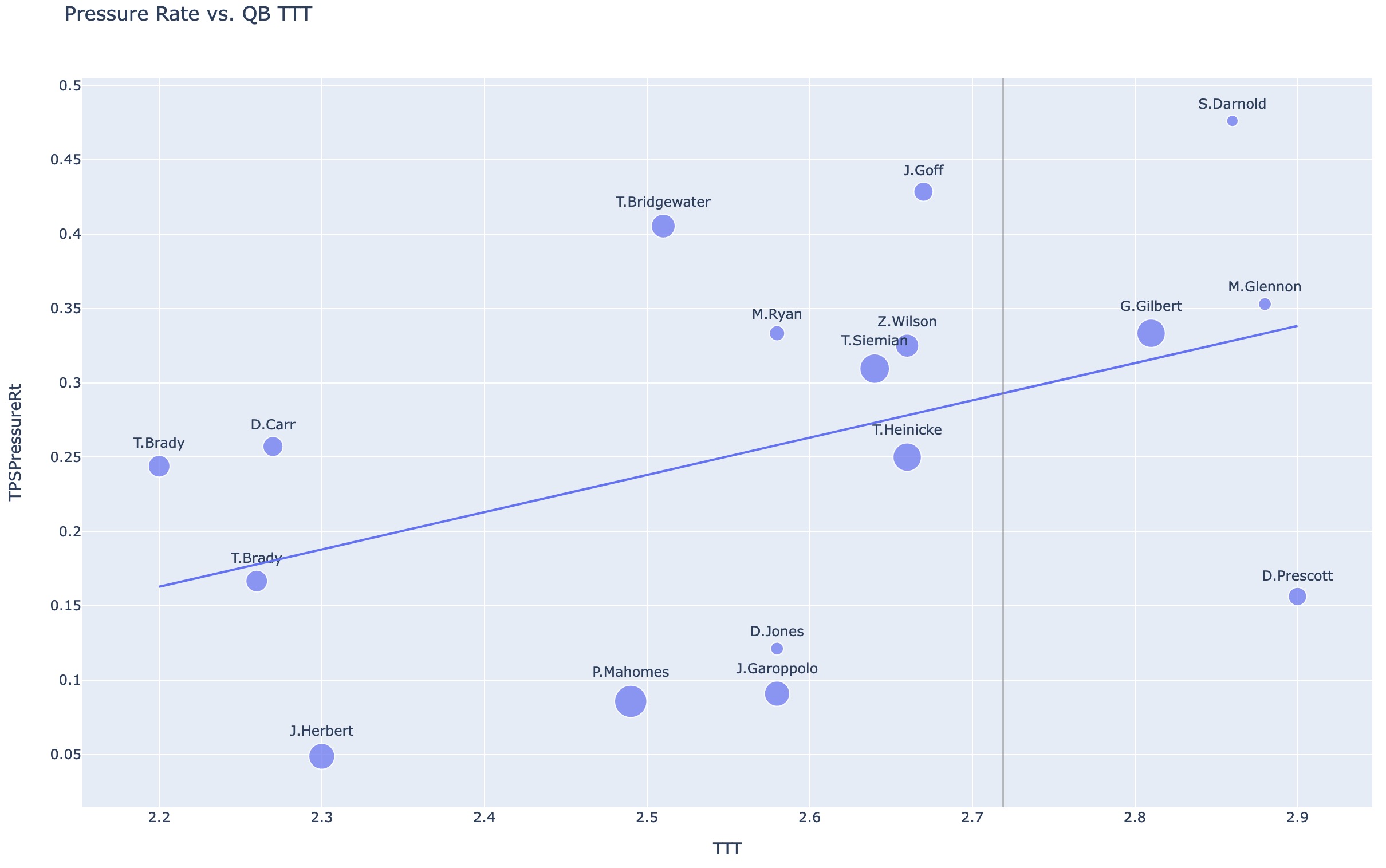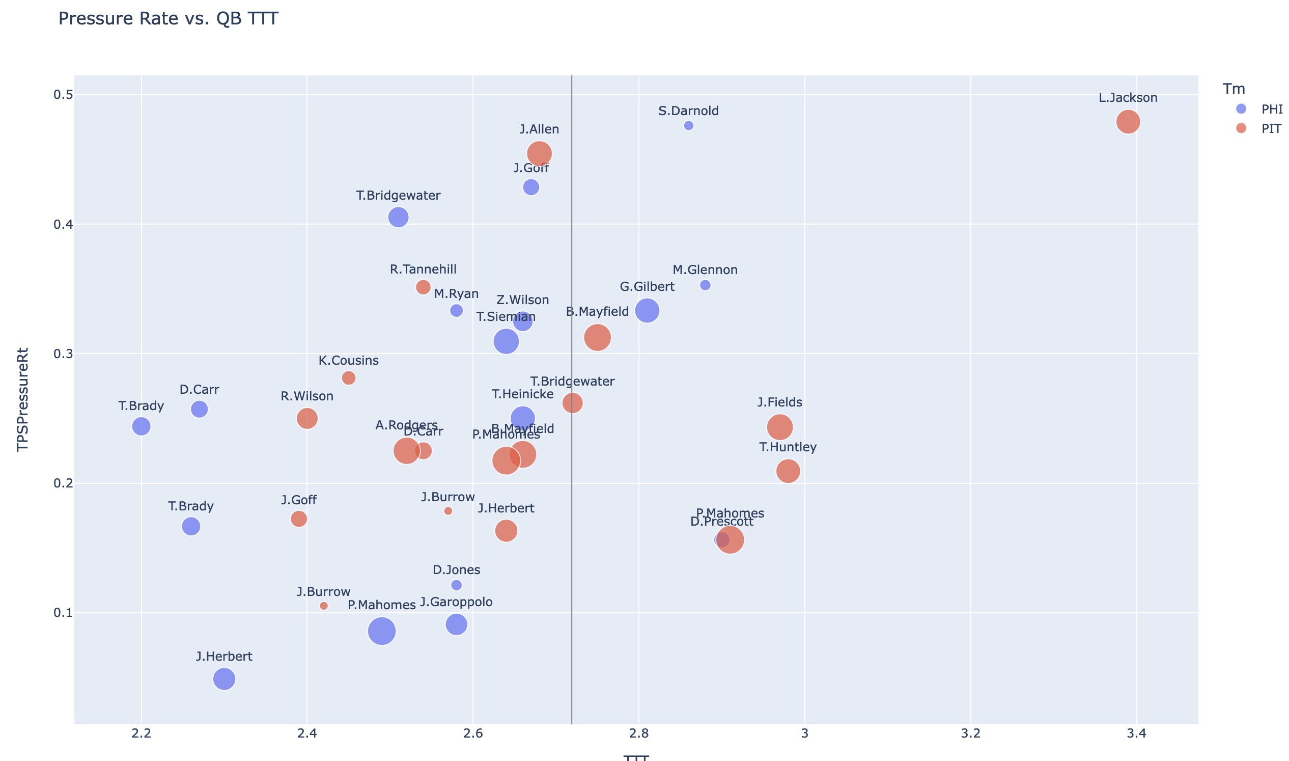 There is obviously a strong correlation between time to throw and pressure across the league - as time to throw drops, so do pressures. Below are 2021 QB average time to throw vs. allowed pressure rate.