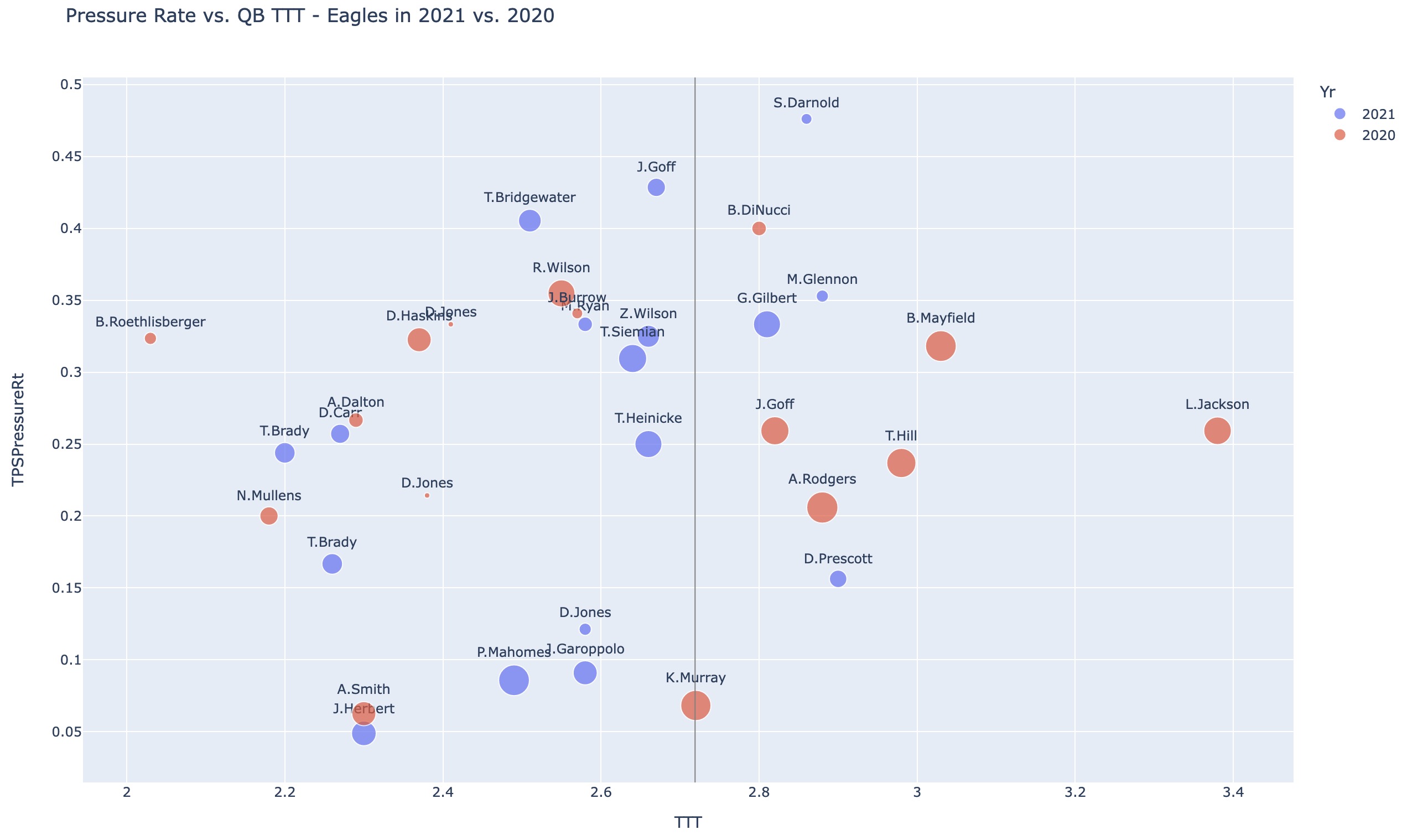 The Eagles saw largely the same effect. Below shows each QB they faced in 2021 with their time to throw vs the Eagles on the x-axis and the Eagles pressure rate on the y-axis. The league average TTT is drawn in as the grey vertical line.