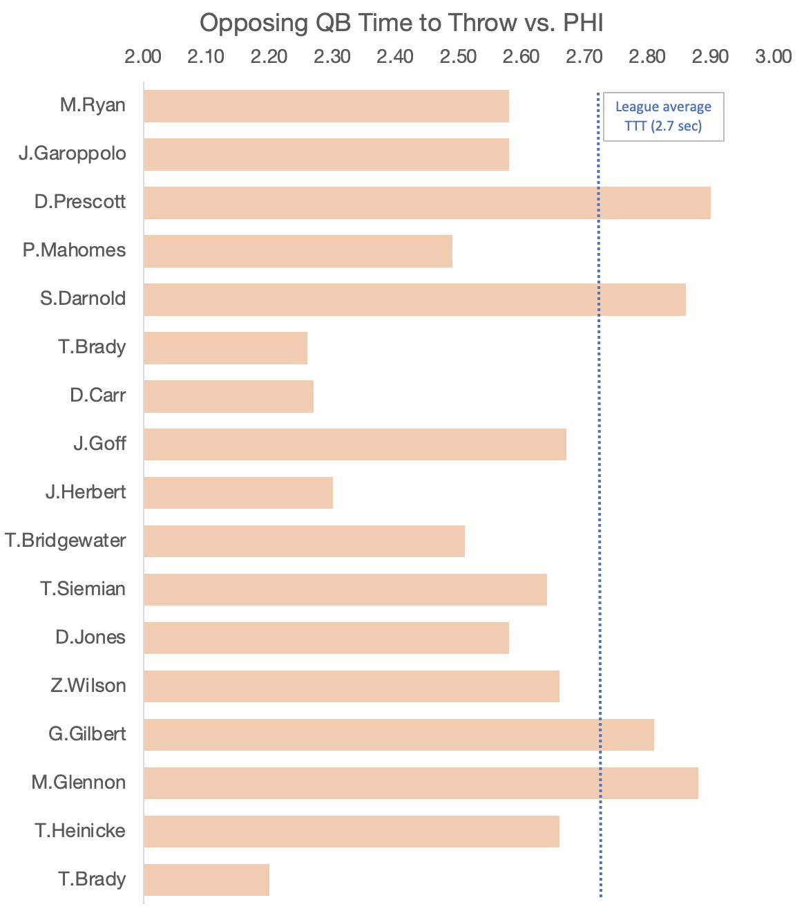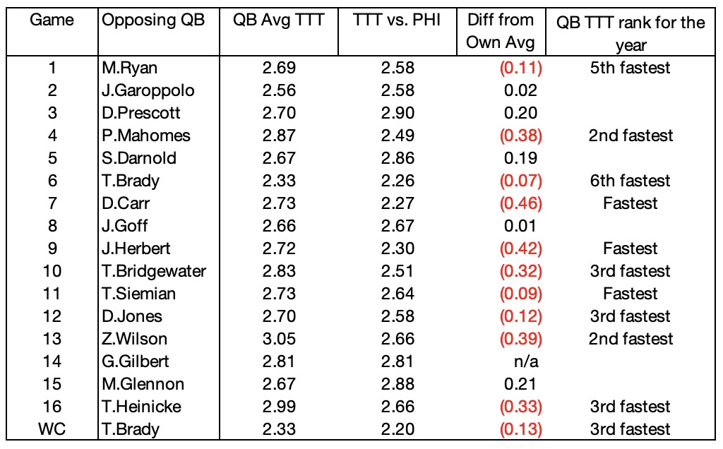 The average time to throw (TTT) for a QB across the league is 2.7 seconds but the Eagles opposing QBs threw the ball much, much quicker. Of their 17 games (I excluded the last regular season game against the Cowboys as starters did not play but included the wildcard game against Tampa), 13 times the opposing QB released the ball below the league average. Only Dak (first Dallas game), Darnold, Garrett Gilbert, and Mike Glennon were above the league average.