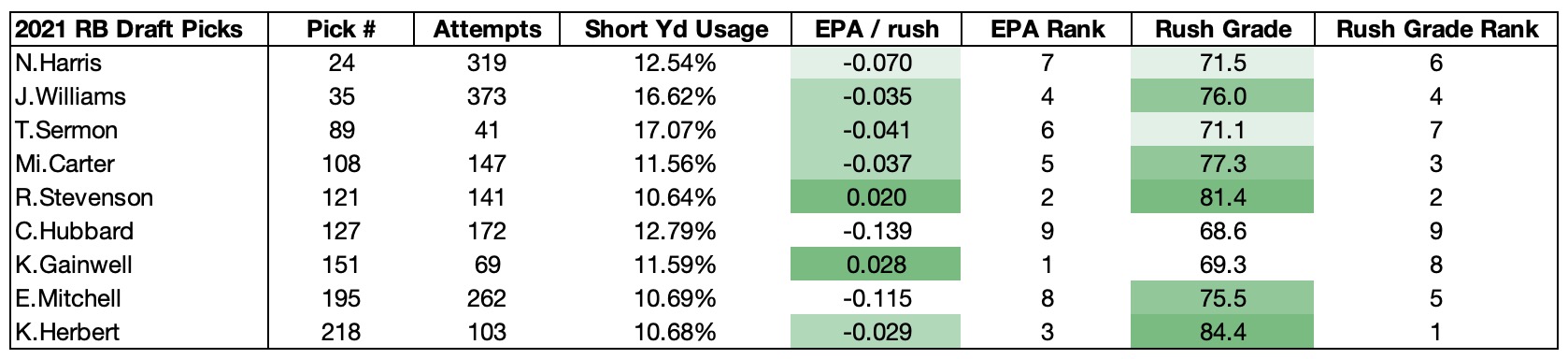When you look at the 2021 backs, the top four elusive backs also happen to be the top 4 run graded and 4 of the top 5 top EPA/rush backs in their rookie season. Kenny Gainwell was actually the highest EPA/rush rookie because he had 5 rushing touchdowns, one from the 1-yard line and the other four from 7 yards out or more, all of which are very highly valued and pushed his aggregate EPA up.