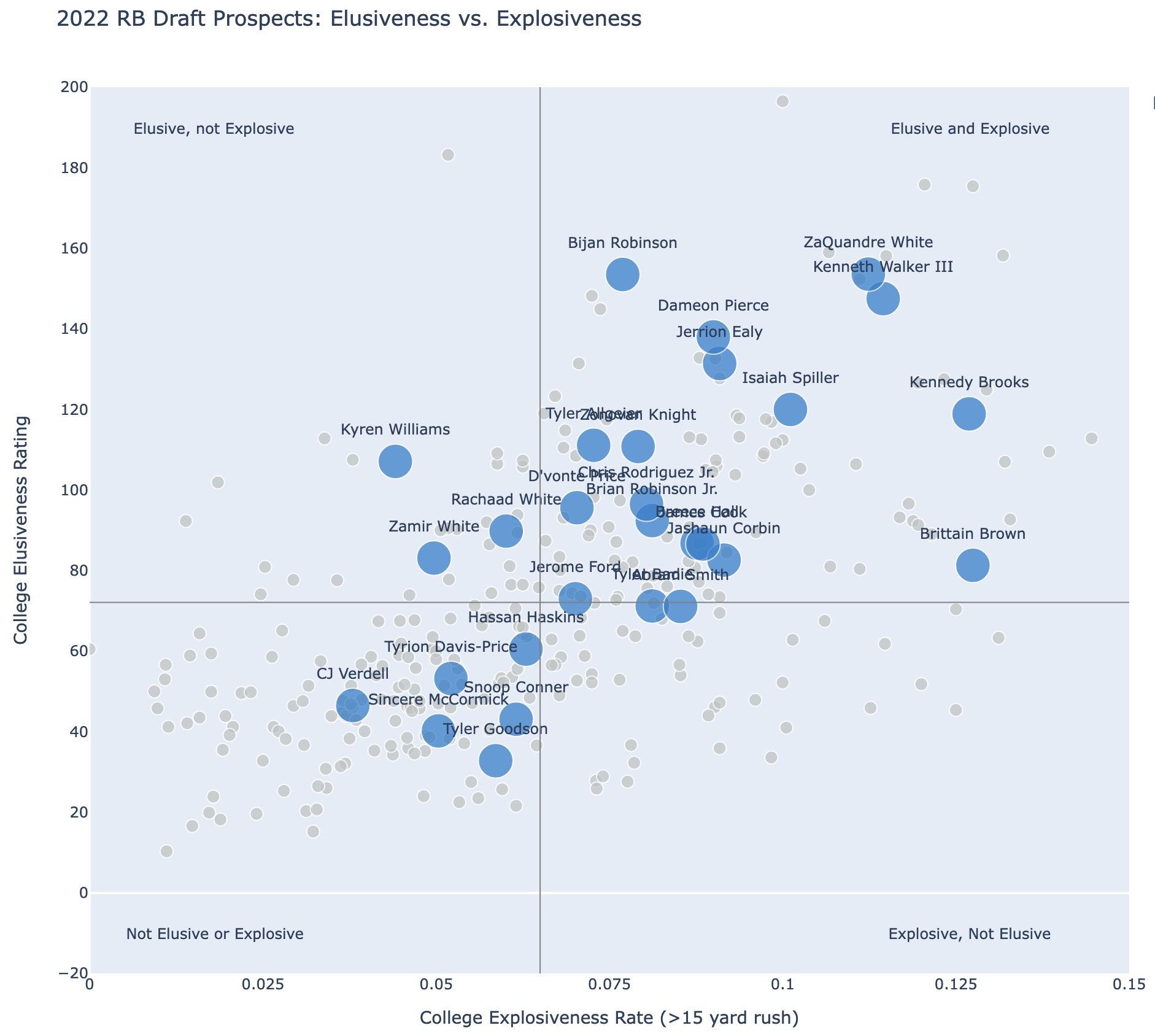 Below shows the same graph I used above but for the 2022 running back draft class showing college elusiveness and explosive rush rate.