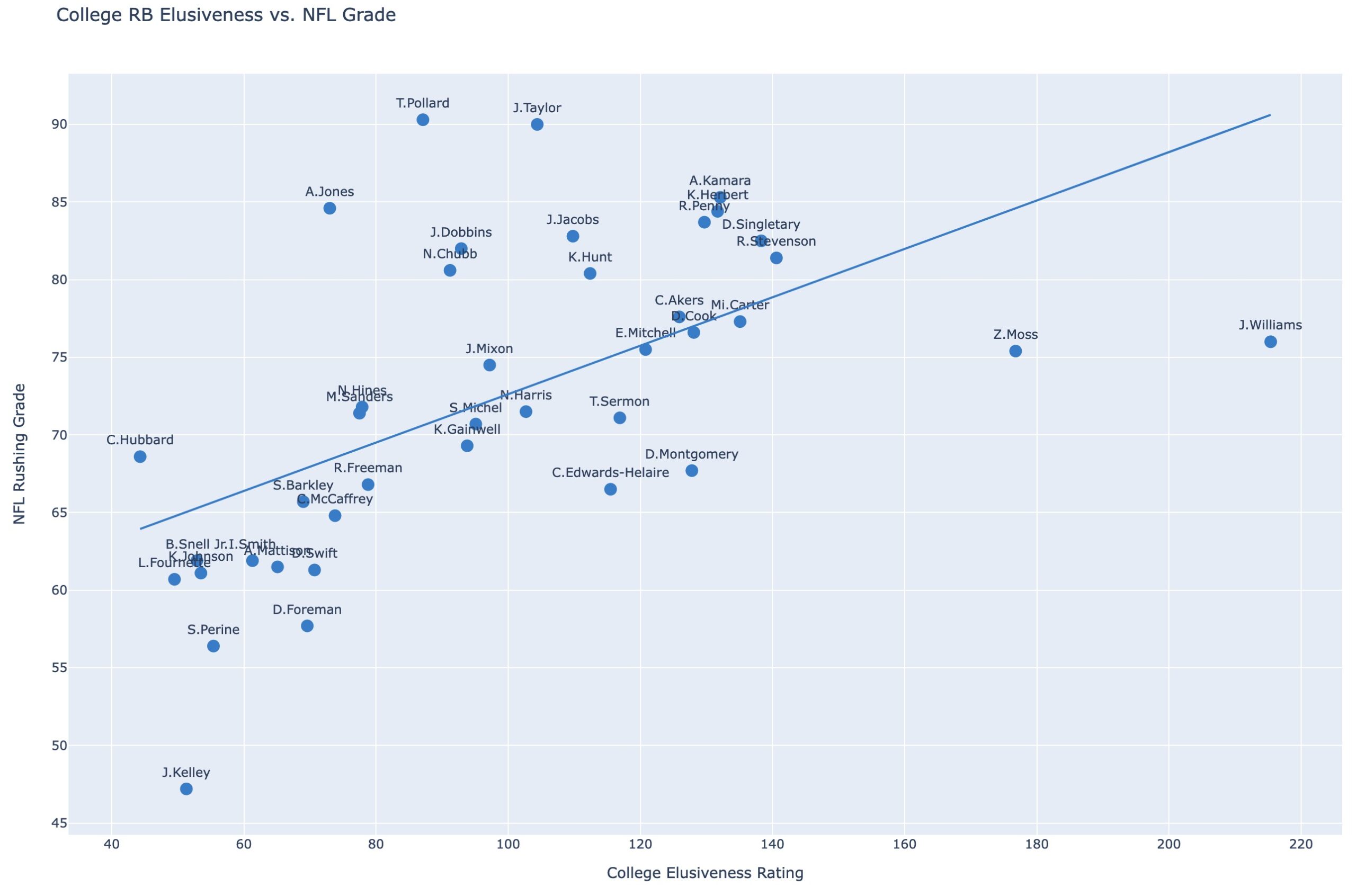 While not perfect (there is no perfect metric here), elusiveness is very helpful. The below shows RBs drafted over the past 5 years with their college elusiveness rating on the x-axis and their NFL rushing grade on the y-axis. While there are exceptions (Pollard and Jones have high ratings despite average elusiveness scores), a back’s elusive rating absolutely correlates with NFL success.