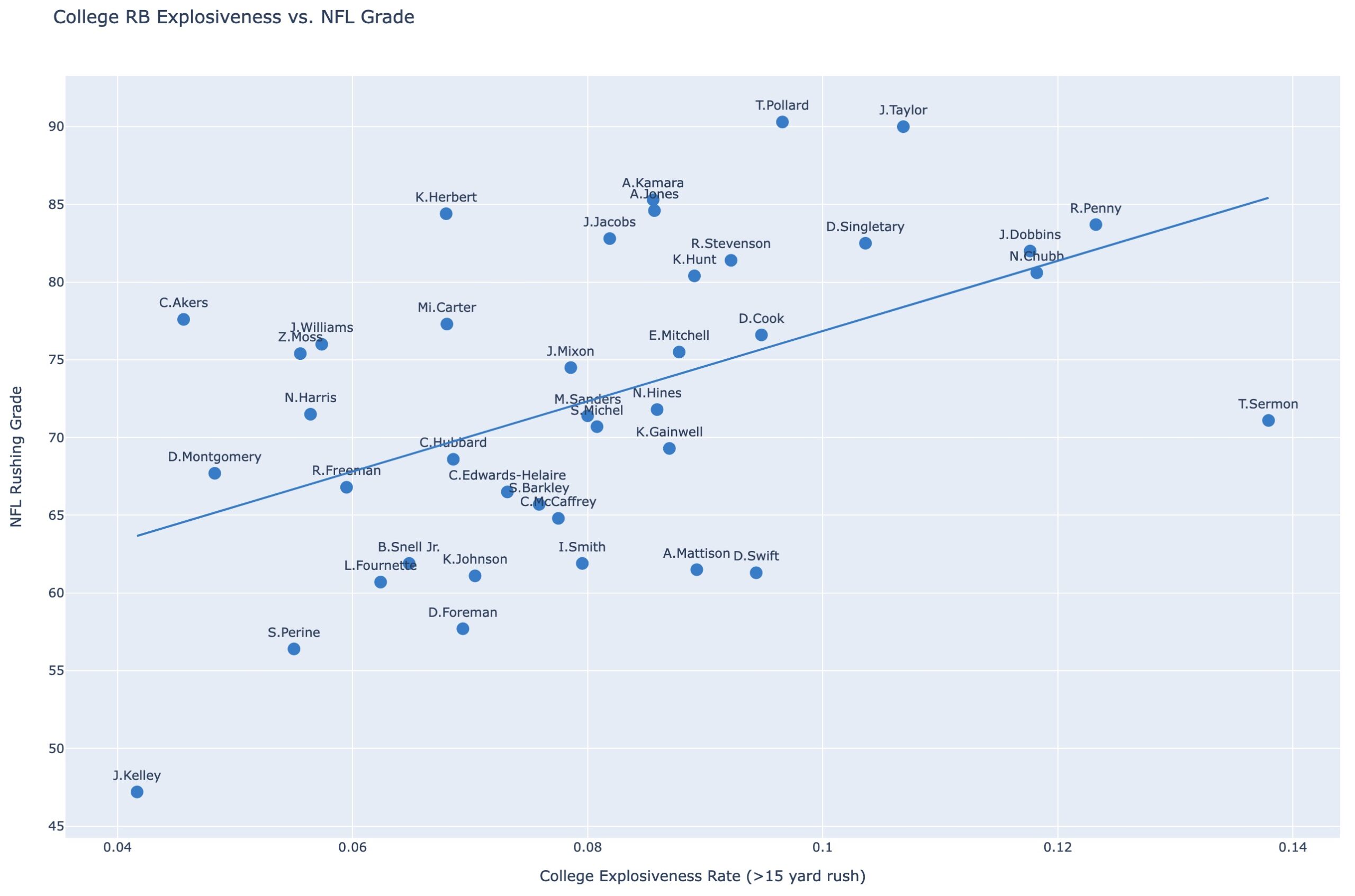 Below shows the same drafted RBs over the past five years with their college explosive rush rate vs. their NFL rushing grade - again, their college performance is predictive of NFL success, although a bit less strongly correlated than elusiveness (explosive rush rate has an R2 of 0.24 vs a better 0.33 for elusiveness).