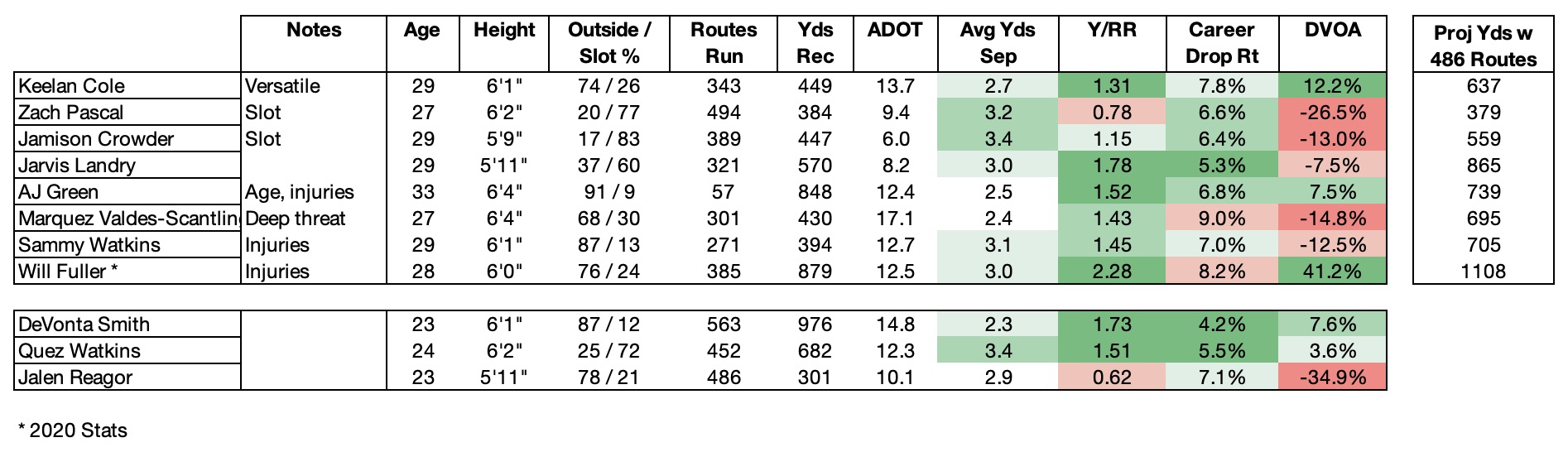 - Keelan Cole, Landry, and Jamison Crowder are my top three. Cole is pretty versatile and sneakily one of the better WRs in DVOA last year. Crowder is a pure slot upgrade, good hands. Landry I am guessing stays in Cleveland but would be another really good option that is versatile.