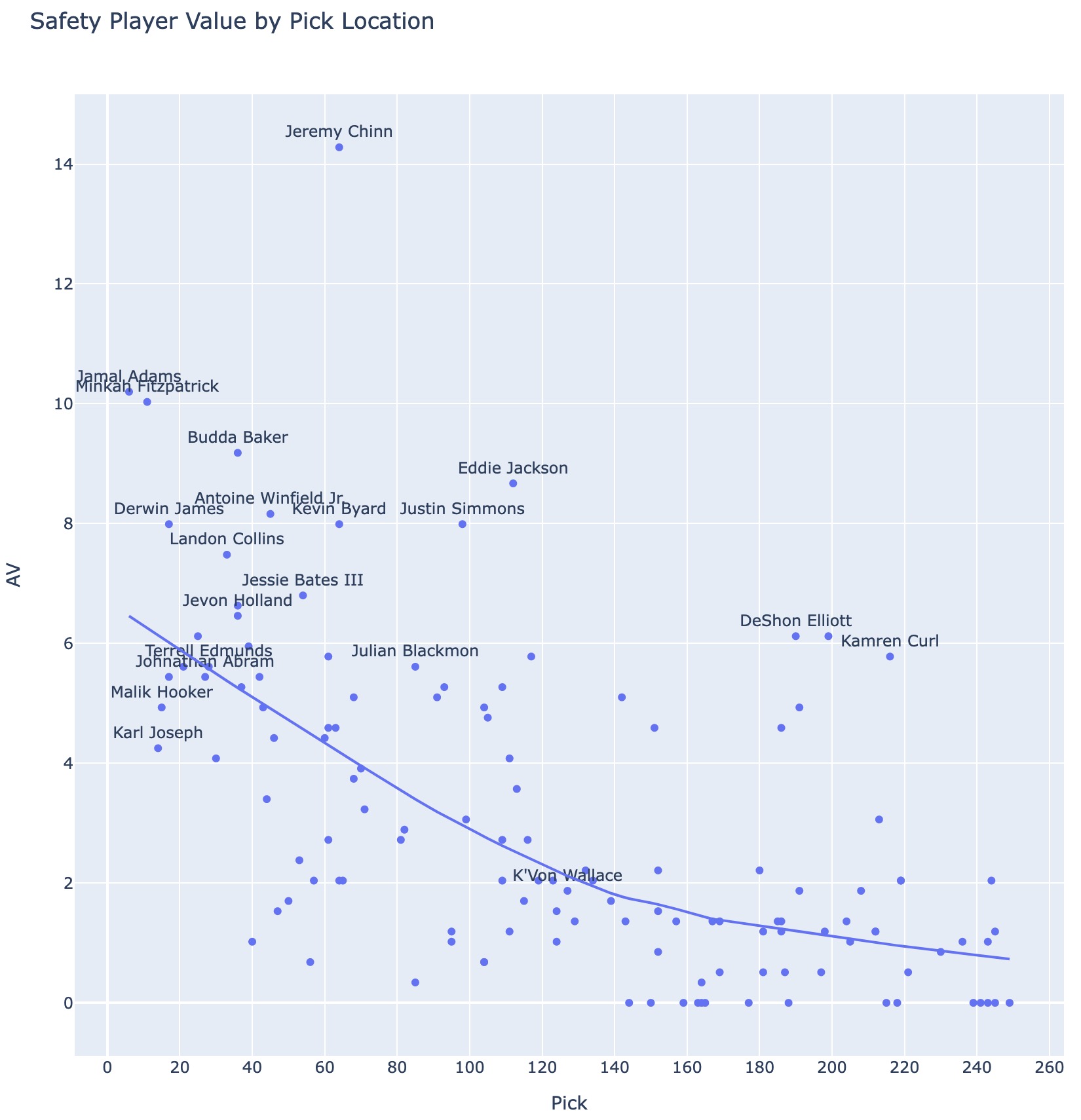 Like all positions, quality players are drafted earlier in the draft. The below shows all safeties drafted from 2015-2021 and their player value (average AV per year) by their draft location. Generally, AV values around 6 are good starters - for context, Rodney McLeod averaged 6AV in his time with the Eagles, Tyrann Mathieu has been around 8AV, and Marcus Williams has been around 6AV.