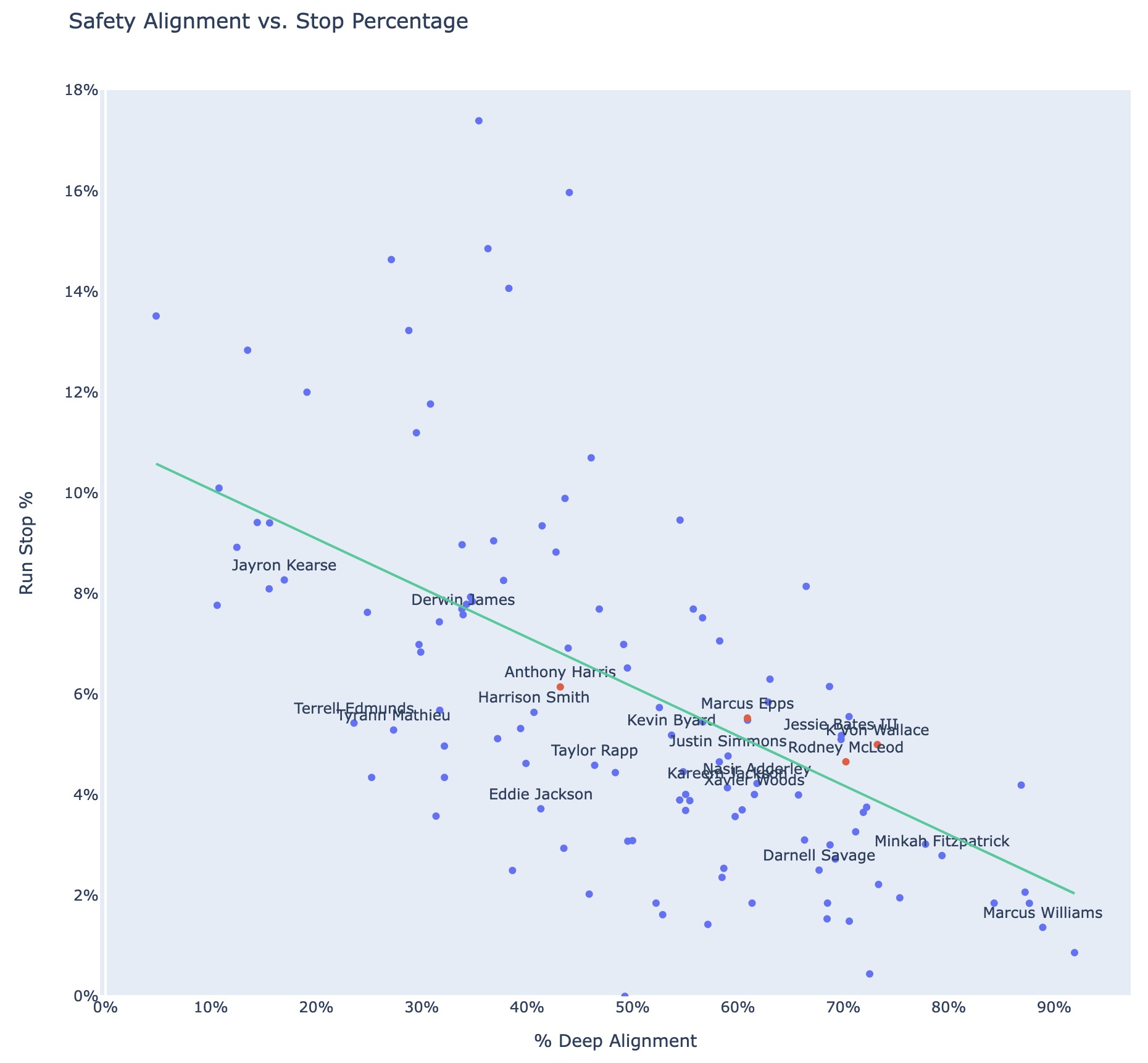 But if you adjust a safety’s run stop rate by the amount of time they align deep, you get a better view of which safeties are able to impact the run game based on their opportunities. Here, Epps and K’Von (although K’Von has a small sample size with only 183 snaps last year) both really stand out - they both played deep at such a high percentage of time and despite that, were able to generate a high rate of run stops.