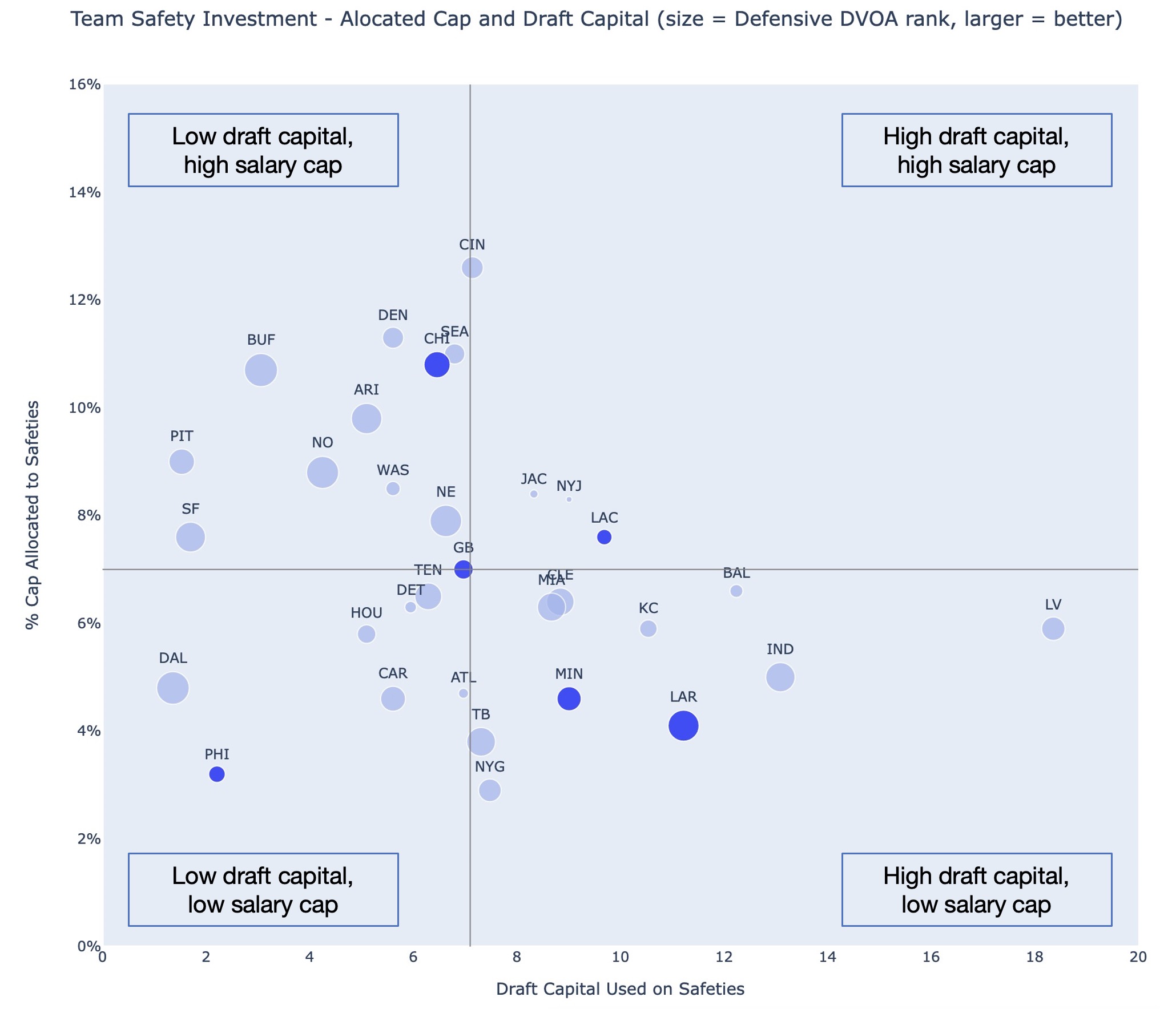 And looking more broadly at the league, the same holds true with teams getting their safeties one way or another and either falling in the top left (spending above average) or bottom right (drafting above average).