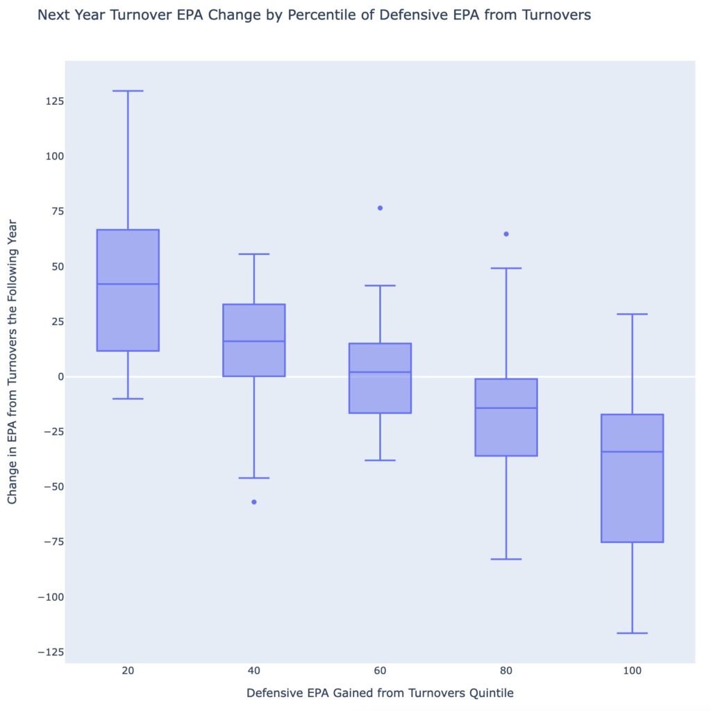 Another view of the same, but this time showing the amount of change by each quintile grouping of defenses. If you aren’t familiar with box plots, they show the average and range of values. The first quintile on the left (20th percentile) are the defenses that generated the least amount of turnover value. The center line inside the box is the average change, which shows these defenses add, on average, 42 EPA of turnover value the next season. 50% of all defenses are inside the box and range from +11 to +65 EPA the following season and the remaining 25% of each side go to the ends of the lines.