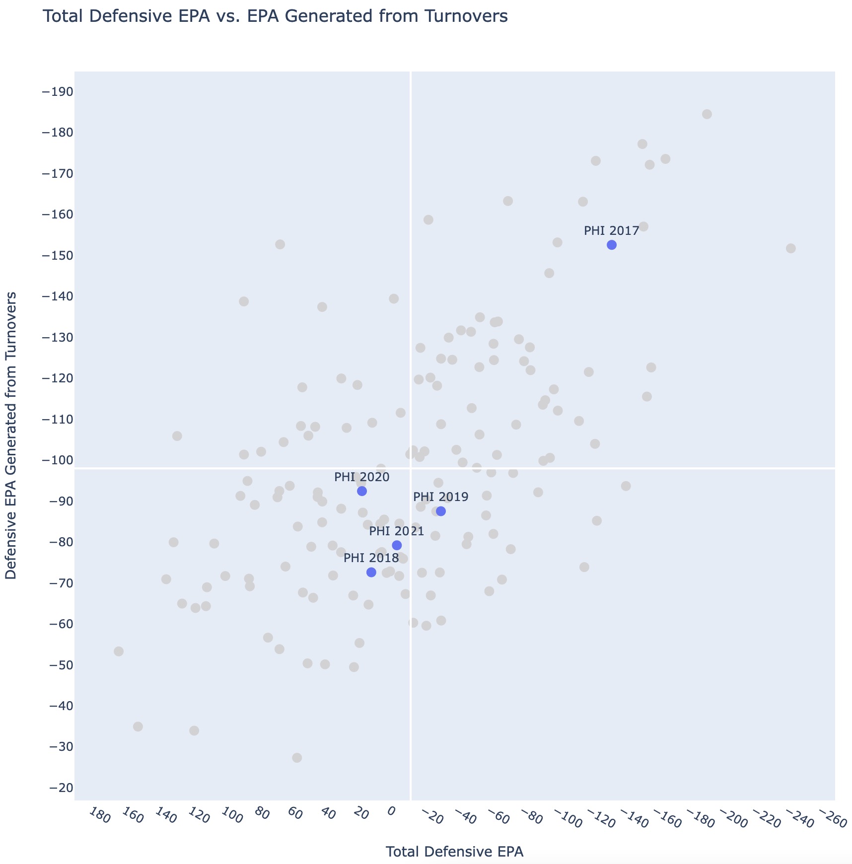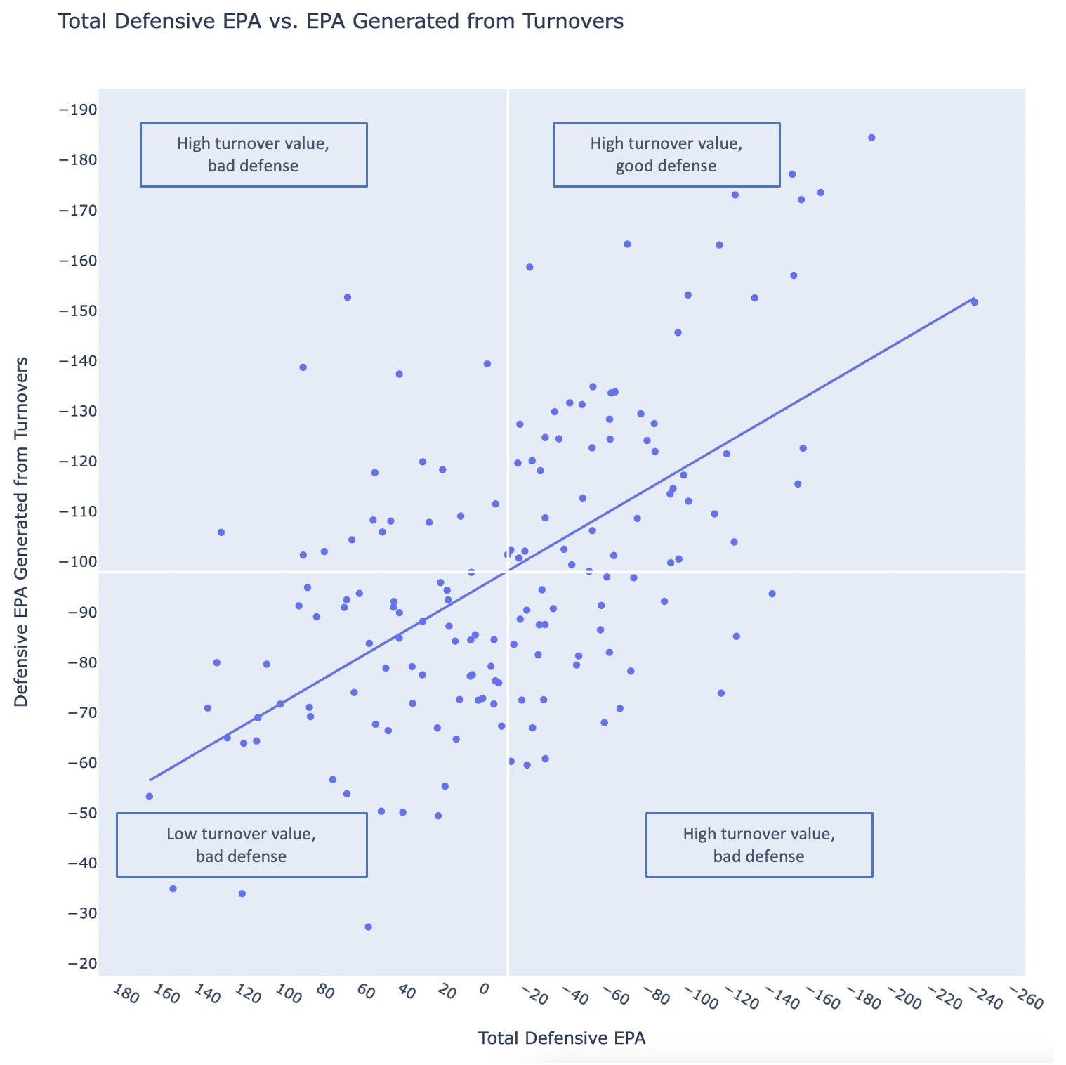 Defenses can be good without turnovers, but typically turnovers and better defenses go hand in hand. Below shows every team over the past 5 seasons with their overall defensive value in EPA on the X axis and the value generated from turnovers on the Y axis (note that for defenses, a more negative EPA is better).