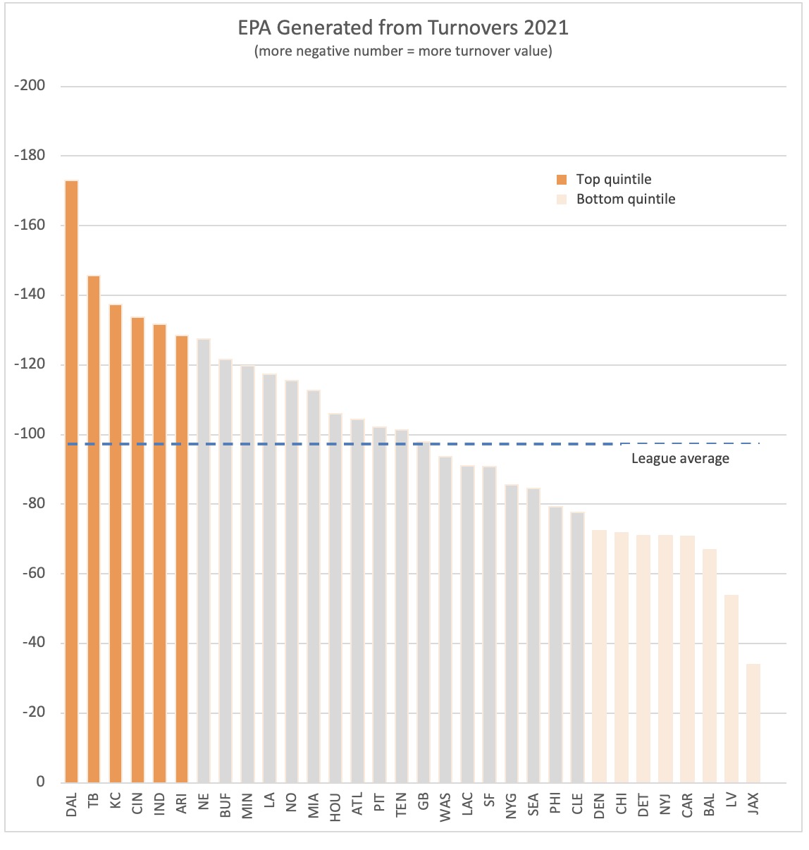 Dallas, Tampa, Kansas City, Cincinnati, Indy, and Arizona were the top quintile teams in 2021 with extremely high defensive value generated from turnovers. You can see how extreme Dallas was, by far the top team in 2021 and 4th best in 5 years. The Cowboys excess turnover value alone was worth over 2 wins last season.
