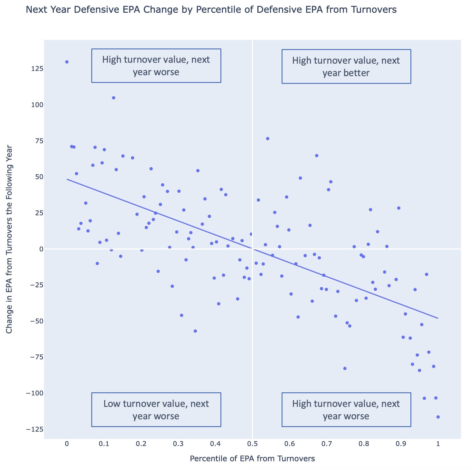 The defenses with the lowest turnover value almost all do better the following year. And on the other side, the vast majority of defenses that generate the most turnover value (the far right) drop the following season, dropping on average 34 EPA generated from turnovers the following season.