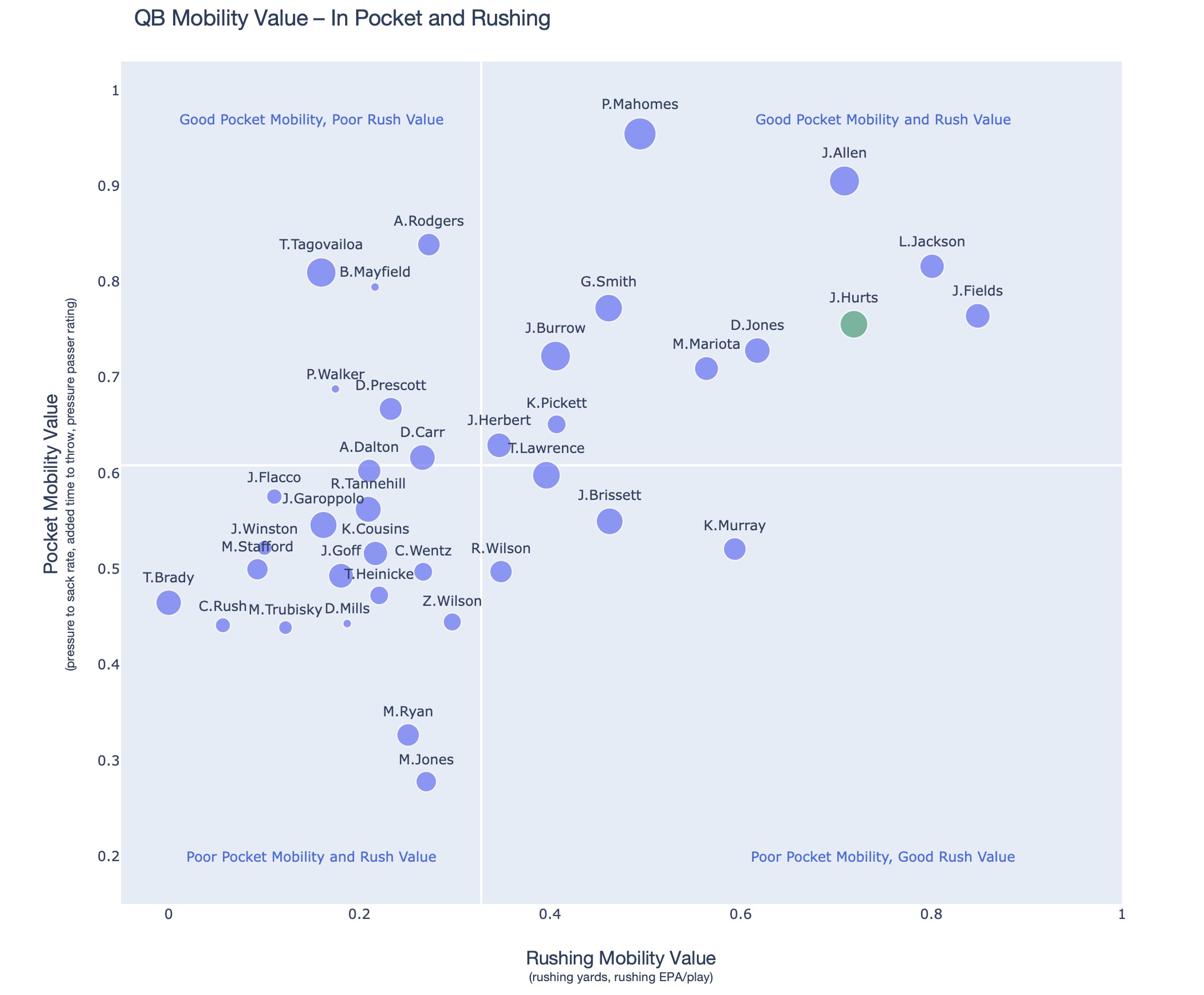 4. The “pocket passers” (bottom left: poor pocket mobility and rushing value):