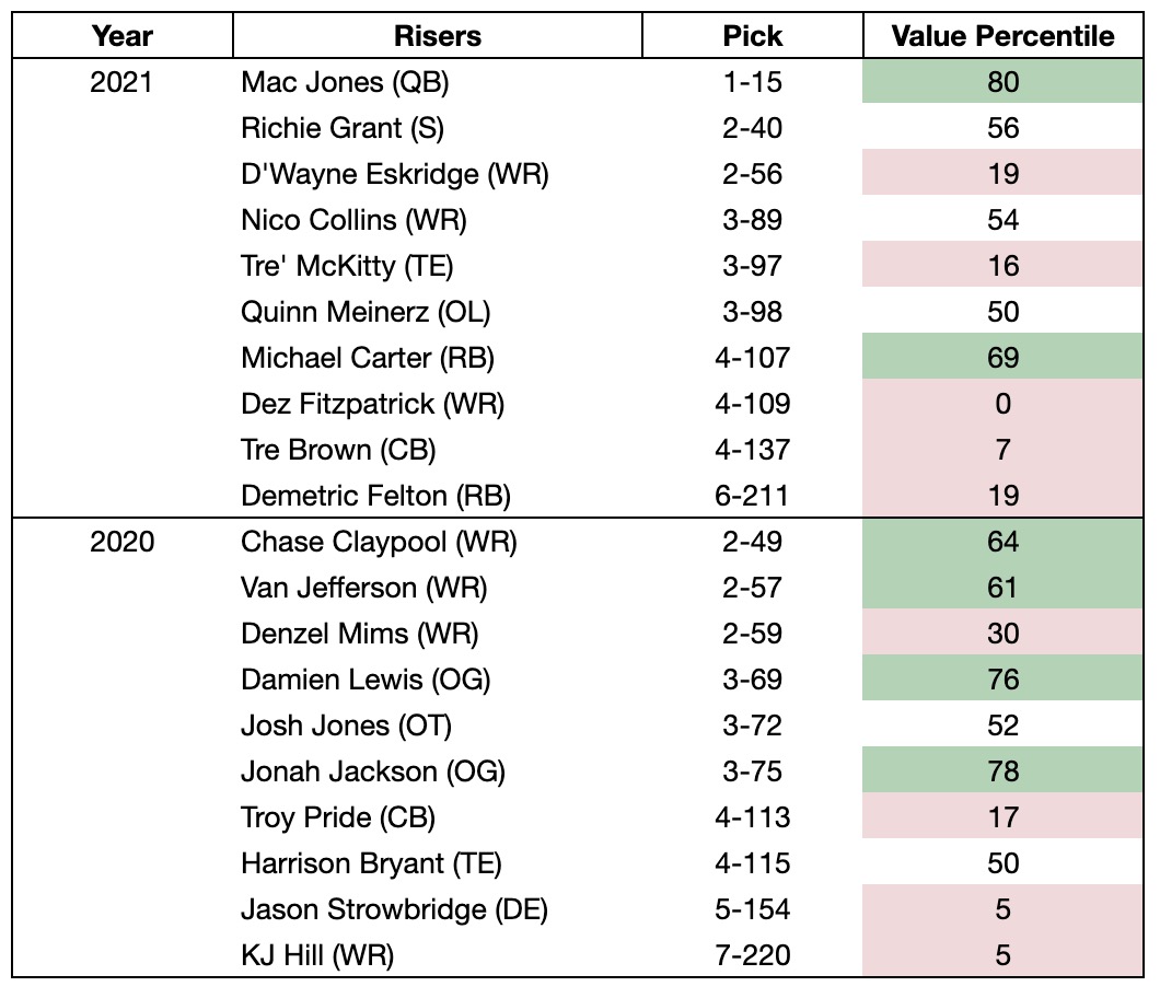 It isn’t fair to judge a player just on their rookie season as plenty of very good players have had bad first years or just didn’t get on the field. The below list includes the 2020 and 2021 risers with their value percentile over their first two or three years in the league: