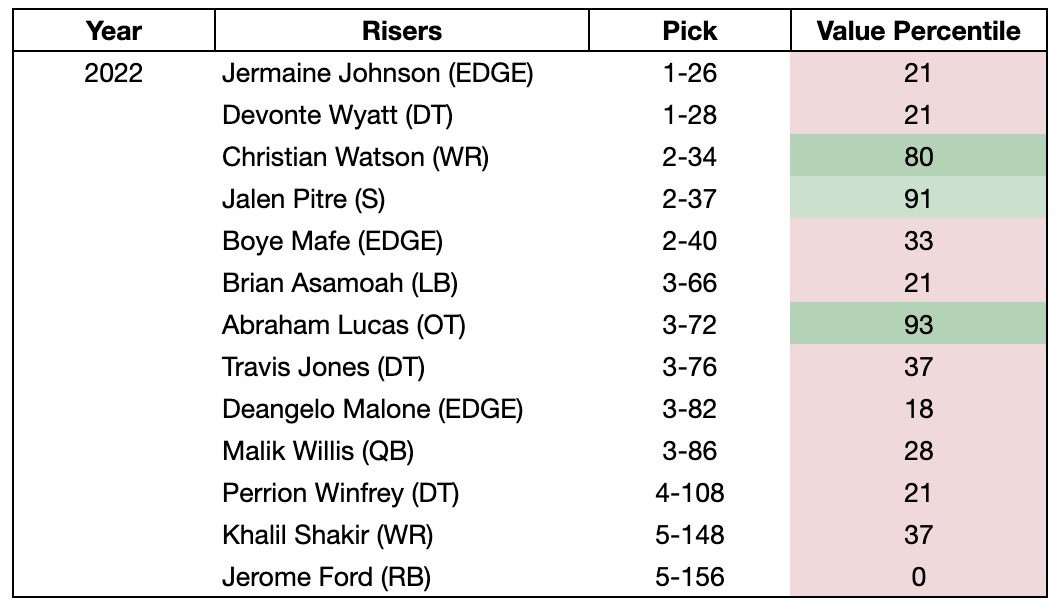 Only 3 of the 13 had first-year success in the league - Christian Watson, Jalen Pitre, and Abraham Lucas. And 7 of the 13 were below 30th percentile in value, including both 1st rounders and three on day 2.