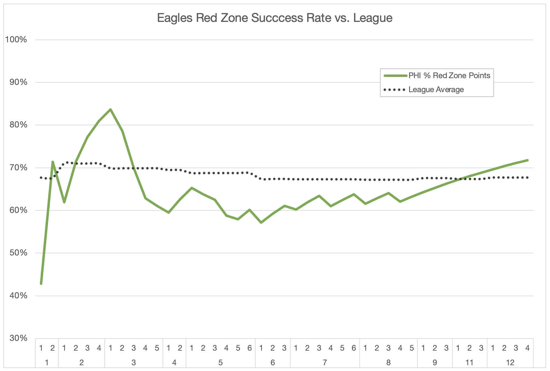 Below shows the Eagles red zone scoring rate over the course of the season (green line) vs. the league average (dashed line). Since week 7, the offense has been on a tear.