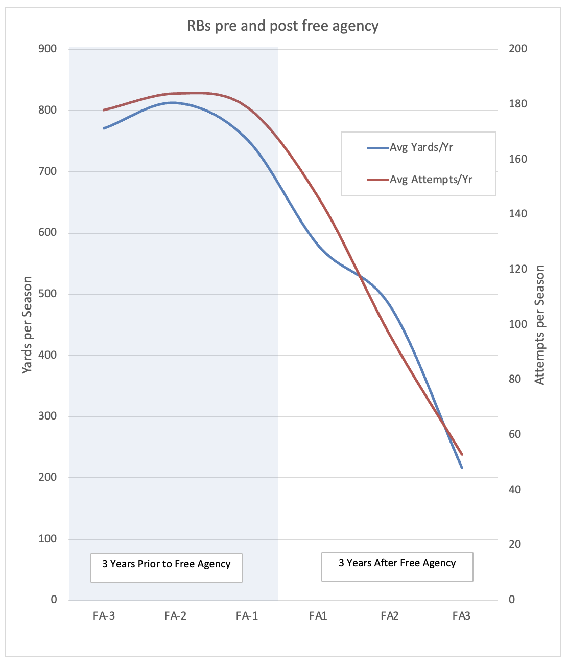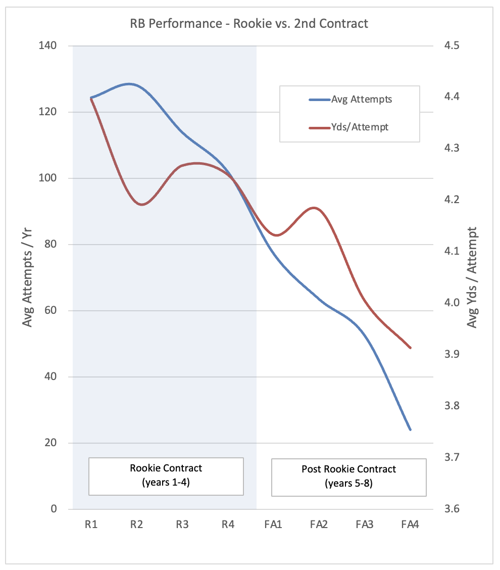 Below are RBs entering the league since 2010 with at least 200 career carries and their yards per attempt and rush attempts per year. The shaded blue area is their 4-year rookie contract (R1 through R4) and then into their second contract (FA1 through FA4).