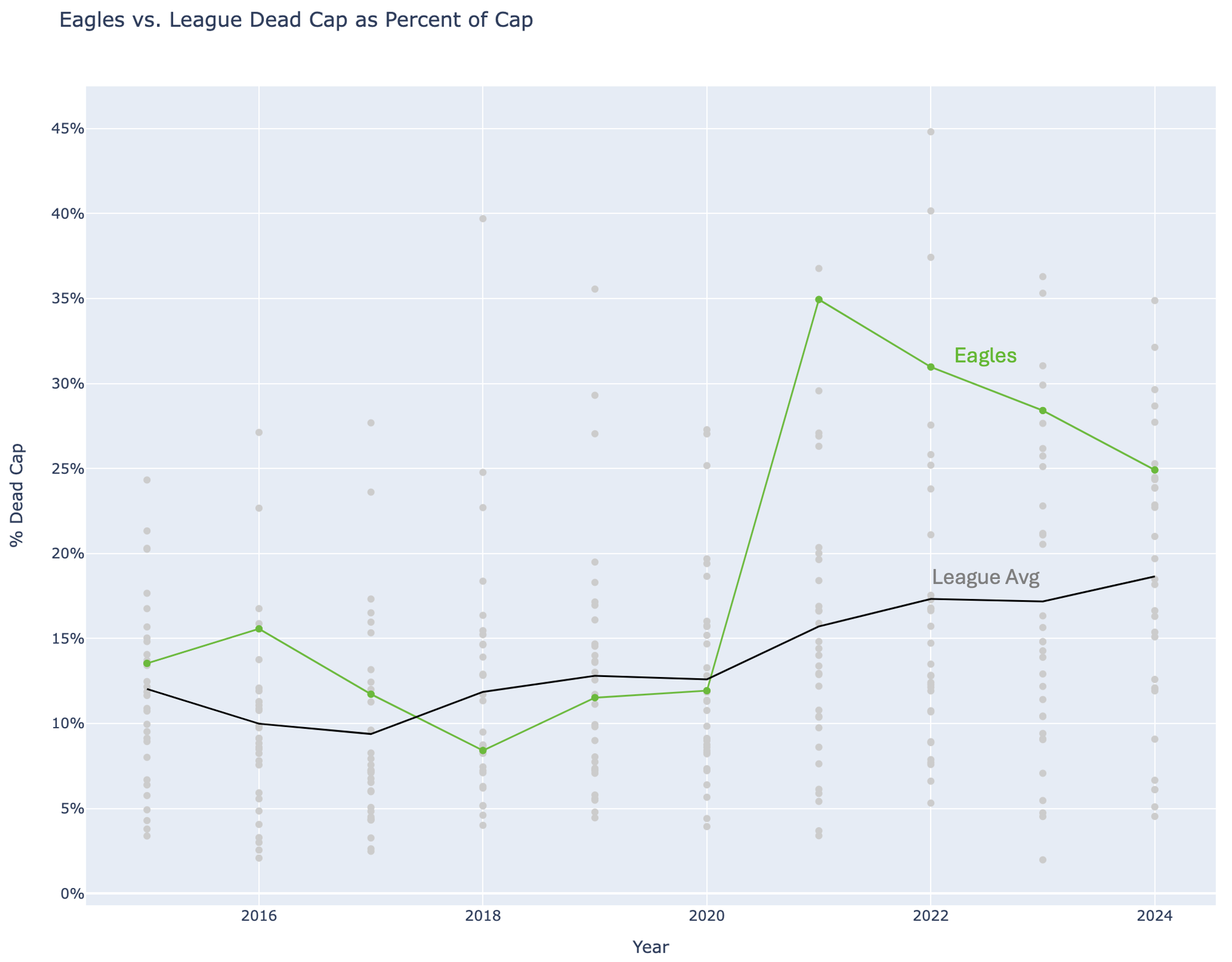 But the Eagles have been even more aggressive, averaging over $60M in dead cap annually and 30% of the cap since 2021, top in the league over the 2021-23 period.