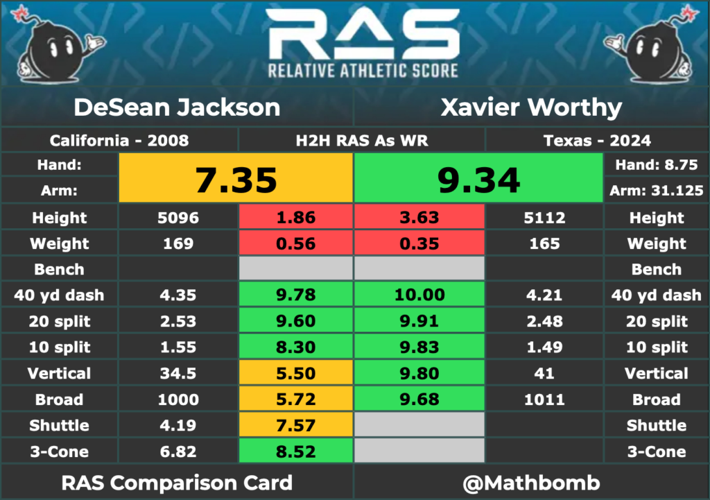 Not saying he will be DeSean but there are similarities. We know Worthy is fast. Here are his testing numbers vs. DeSean - similar except Xavier is faster and a bit more explosive.